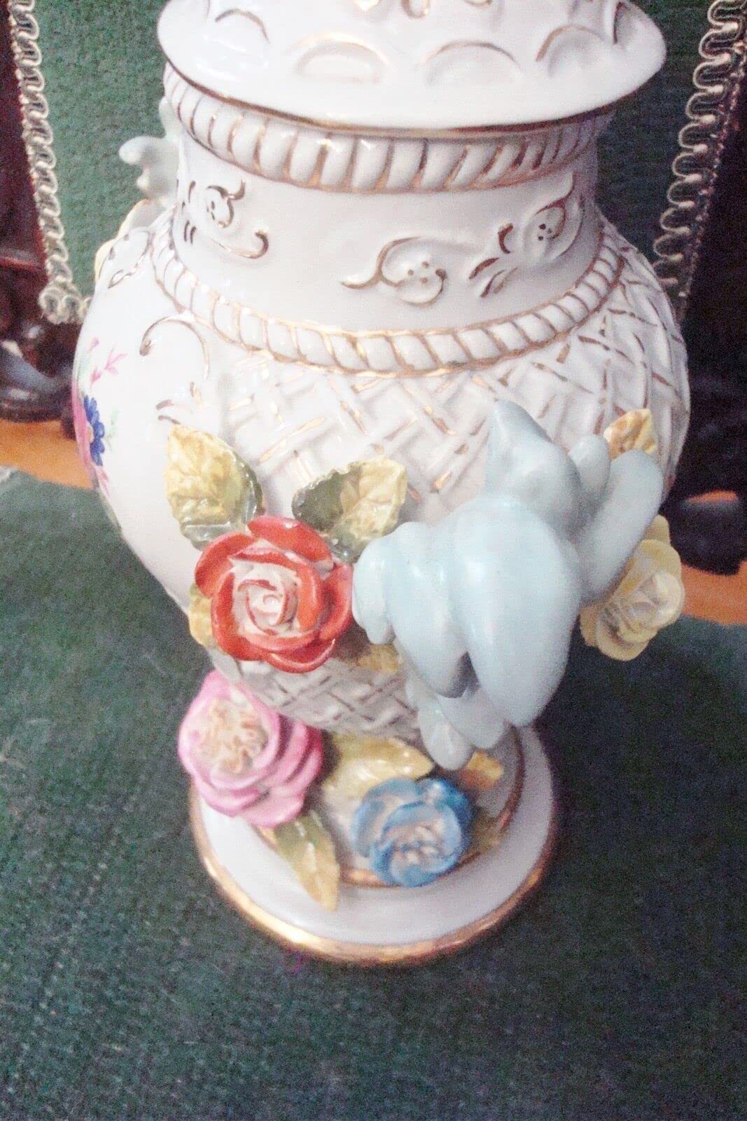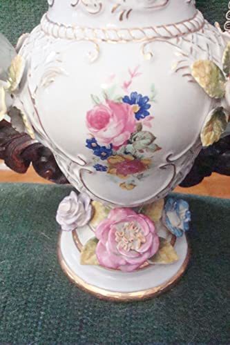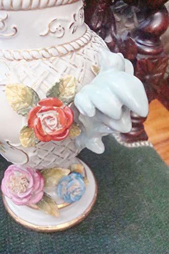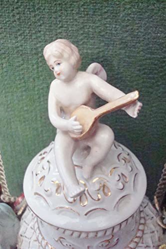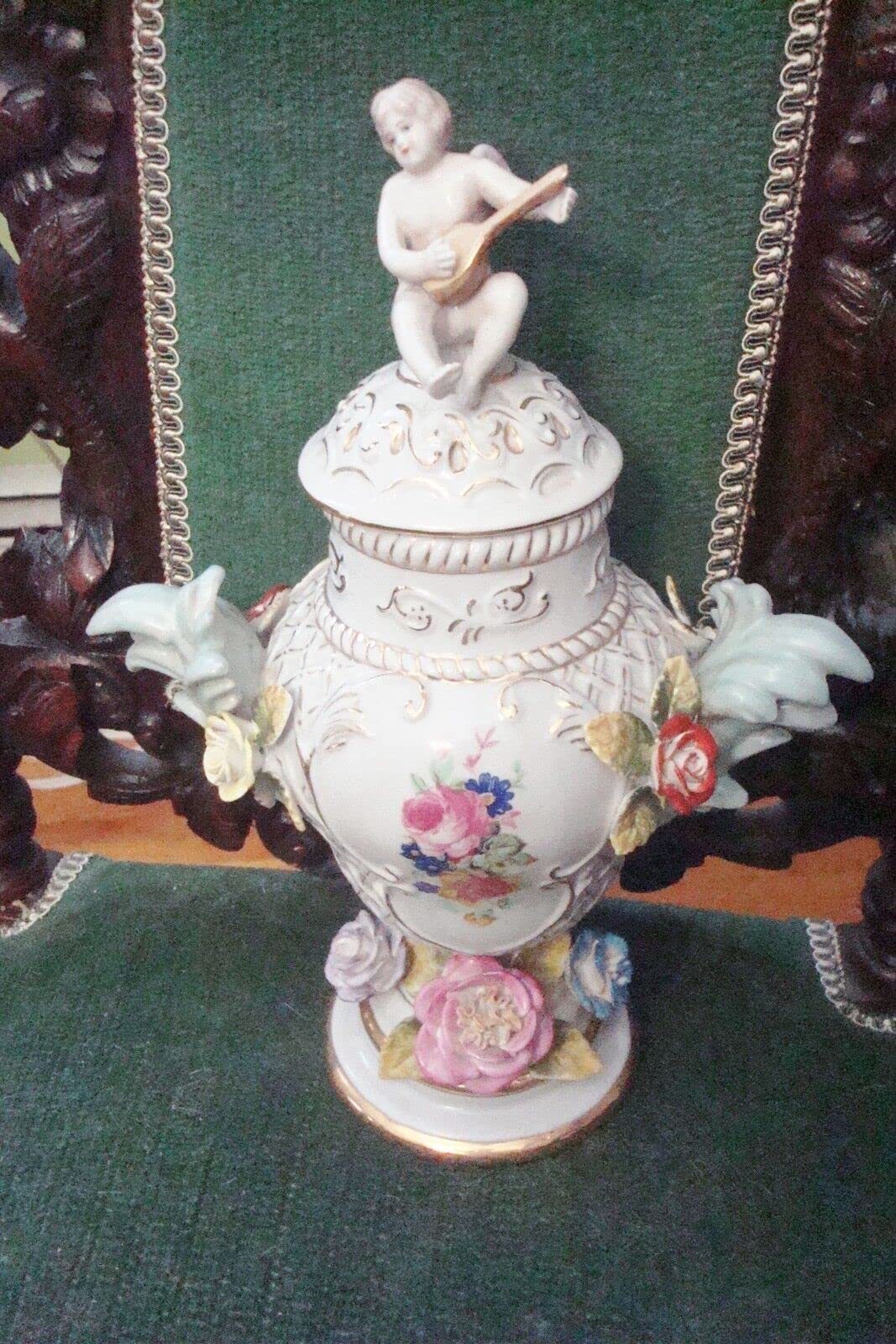 VOLKSTEDT - GREINER HOLZAPFEL VOLKSTEDT mark, Germany, (also on recent Chinese Imports) beautiful covered ur, decorated with angel playing an instrument and roses, profuseluy decorated, a great piece, 12" tall by 8 1/2", condition, no damage, chips or hairlines, light surface scratches commensurate with age, flowers mey have scratches. Listed as German, may also be a chinese import, difficult to say, this is one of the most coveted marks in German pottery, whis piece is exceptionally made.