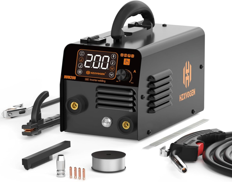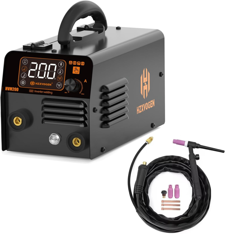 HZXVOGEN 110V MIG Welder 200A Flux Core Welder 3 in 1 Gasless MIG Welder/Lift TIG/Stick Welding Machine Portable IGBT Inverter Large LED Display Automatic Wire Feeding Welder Machine and WP17V 4M Welder Torch 140A 150-Amp Air Cooled SR-17V TIG Welder Gun with Europe Plug