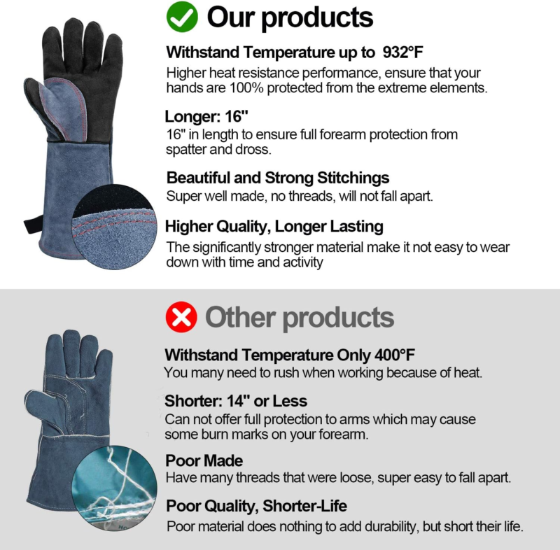 HIGHER HEAT RESISTANCE PERFORMANCE FULL PROTECTION ? HZXVOGEN welding gloves are guaranteed to withstand extreme temperatures up to 932F(500?). The top quality three layers ( 1. Outer layer: 1.3mm thick cowhide leather, 2. Fire/ heat protection layer: air-isolated aluminum foil, 3. Skin layer: insulated cotton lining), along with welted seams and lining , ensure that your hands are 100% protected from the extreme elements that you work with on a daily basis.