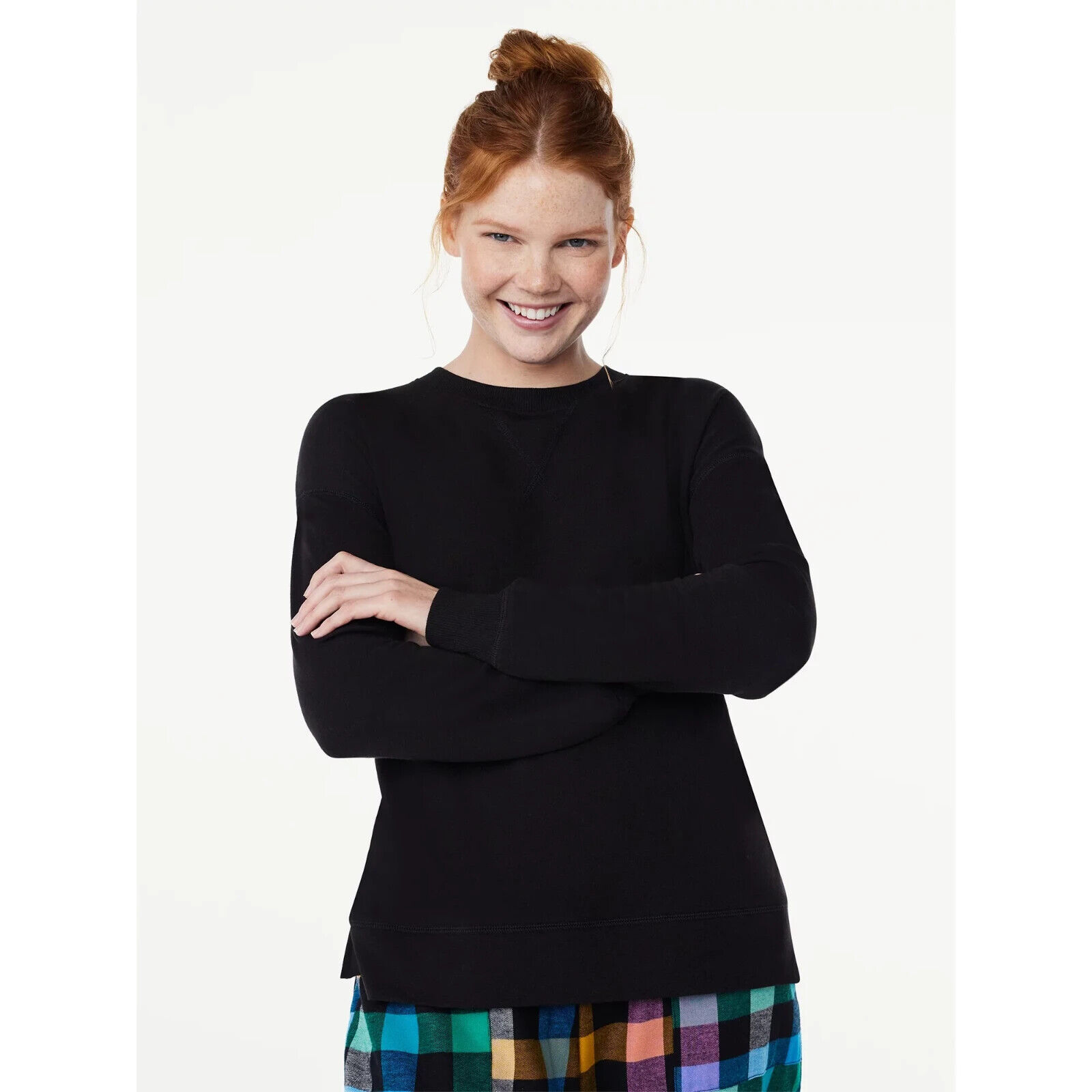 Features: Ultra-soft French terry knit; banded cuffs and hem; side slits at hem; flat seam detailing at neckline