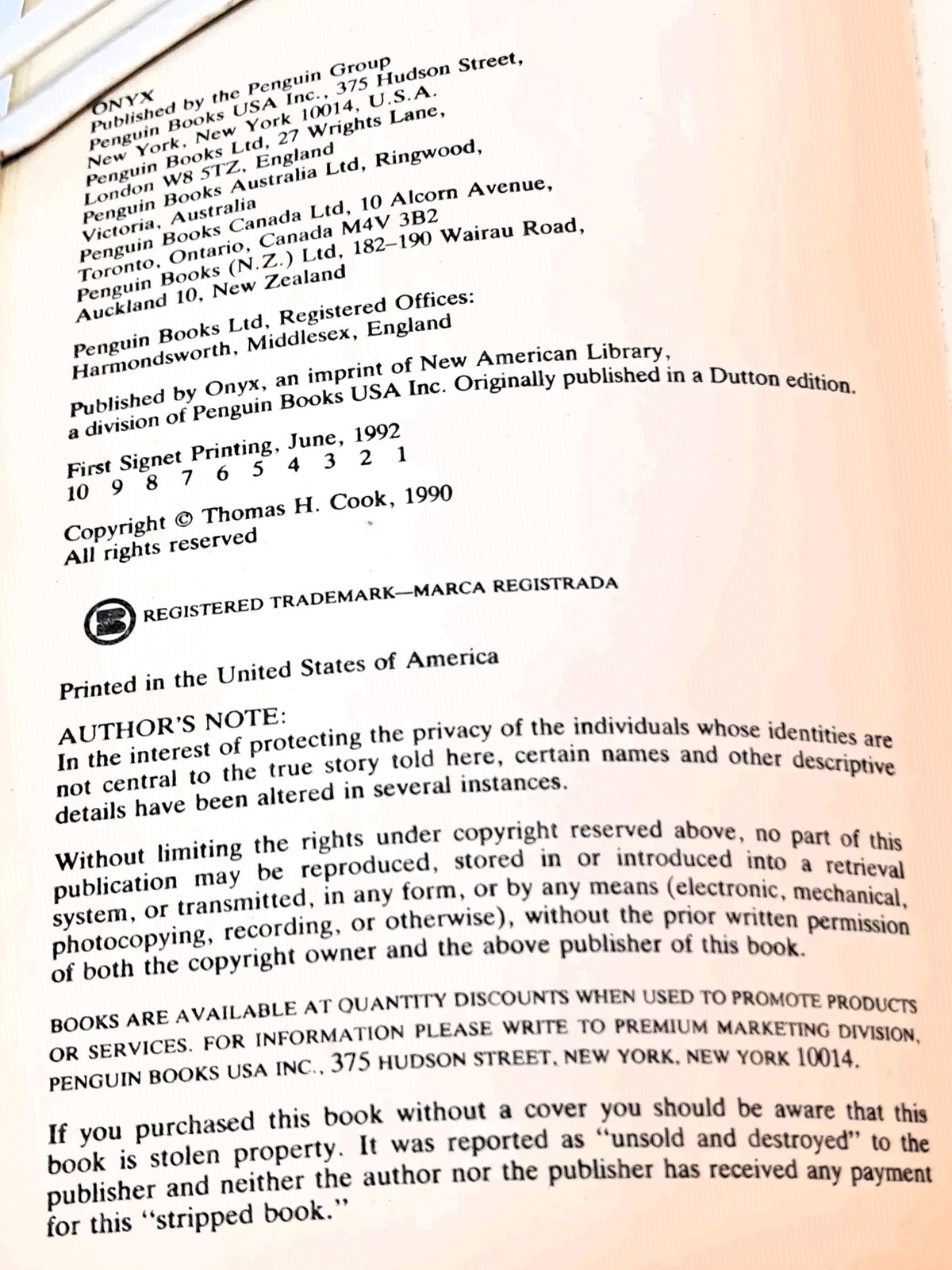 Copyright 1990. This copy stated from First Signet Printing, June 1992 with full print-line, but marked as published by Onyx (also owned by Penguin Group). Originally published in a Dutton edition. Printed in U.S.A. Cataloged as Onyx True Crime: 451-JE296. ISBN: 0-451-40296-0. No LCCN. MSR = US $4.99.
