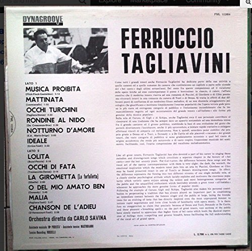 Product description: Ferruccio Tagliavini ?? Romanze Di Sempre Label: RCA Italiana ?? PSL 10384 Format: Vinyl, LP, Album, Stereo Country: Italy Released: 1964 Genre: Pop Style: Vocal Tracklist Hide Credits A1Musica Proibita Written-By ? Flick-Flock*, Gastaldon* 3:14 A2Mattinata Written-By ? Leoncavallo* 1:55 A3Occhi Turchini Written-By ? Denza*, Pagliara* 3:22 A4Rondine Al Nido Written-By ? Sica*, De Crescenzo* 2:30 A5Notturno D'Amore Written-By ? E.A. Mario*, Drigo* 3:05 A6Ideale Written-By ? Errico*, Tosti* 3:33 B1Lolita Written-By ? Buzzi-Peccia* 2:18 B2Occhi Di Fata Written-By ? Denza*, Tremacoldo 3:14 B3La Girometta (La Farfalletta) Written-By ? Sibella* 2:00 B4O Del Mio Amato Ben Written-By ? Donaudy* 3:49 B5Malia Written-By ? Tosti*, Pagliara* 3:47 B6Chanson De L'Adieu Written-By ? D'Haraucourt*, Tosti* 2:28 Companies, etc. Pressed By ? RCA Records Factory, Italy Credits Conductor [Orchestra] ? Carlo Savina Musical Assistance ? M Podesta* Photography By [Cover] ? Cortini, Studium Technician [Recording] ? Rosselli* Technician [Technical Assistance] ? Mastroianni*