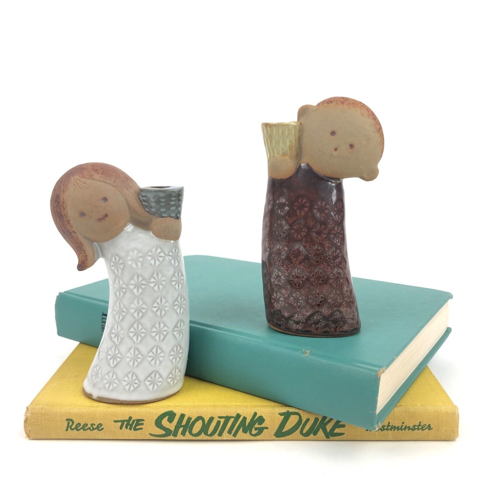 Pair Vintage UCTCI Mid Century Stoneware Boy Girl Figural Candle Holders Rare