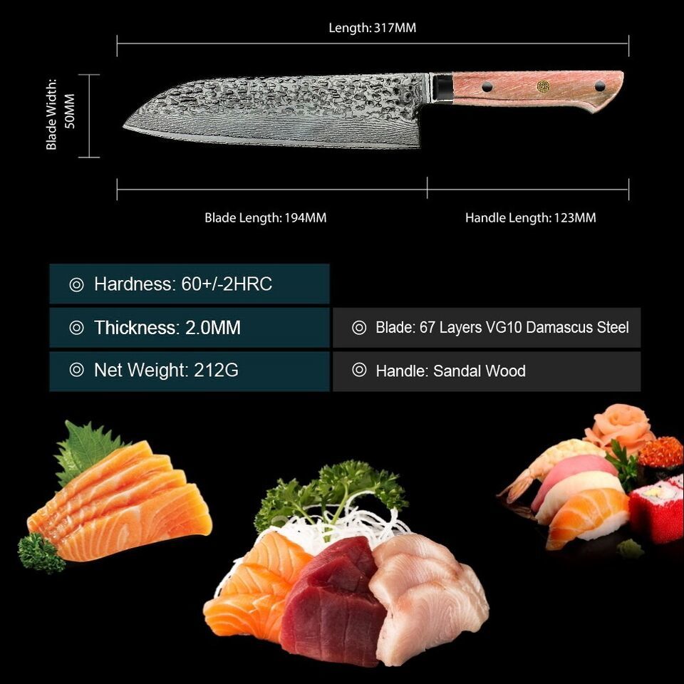 Japanese Santoku Knife Chef Kitchen Knife Damascus Steel Sandal Wood Handle