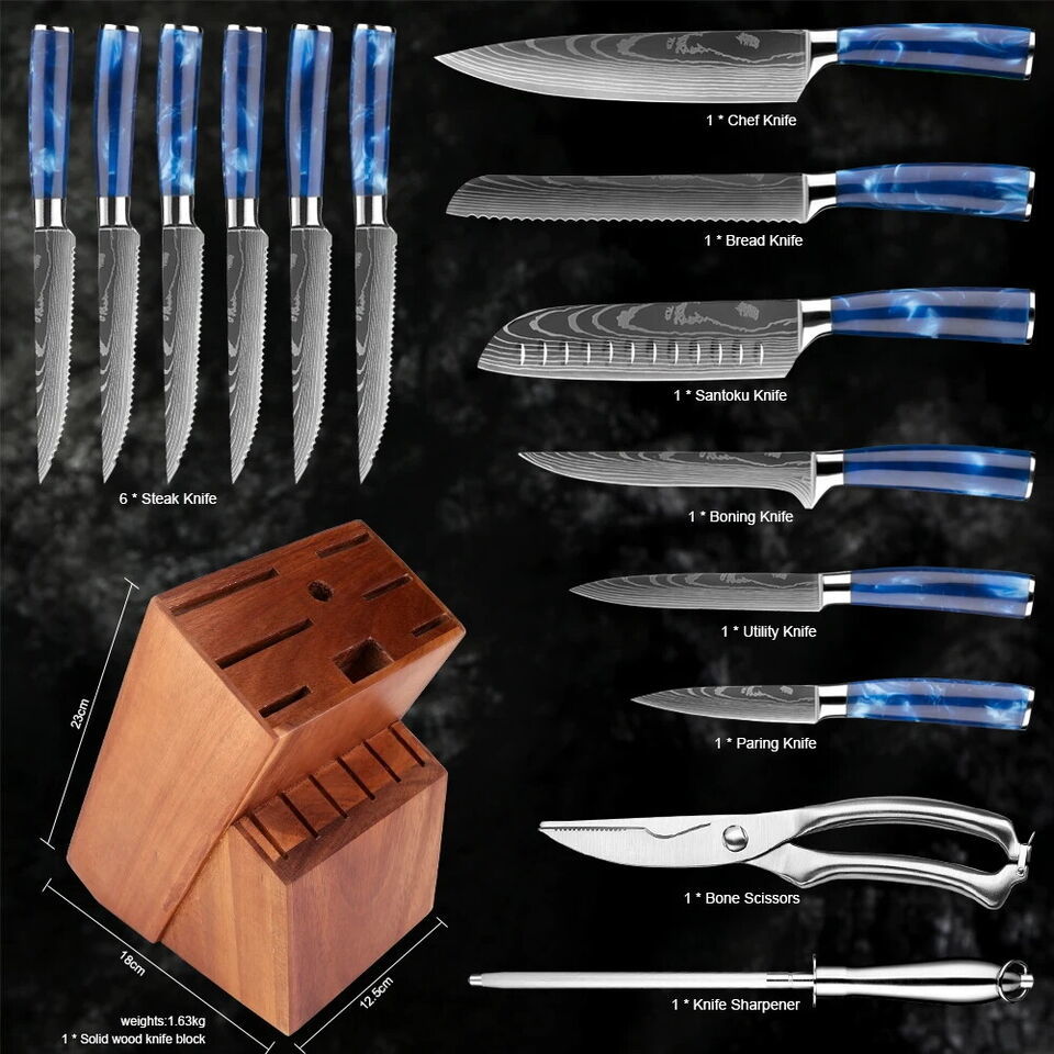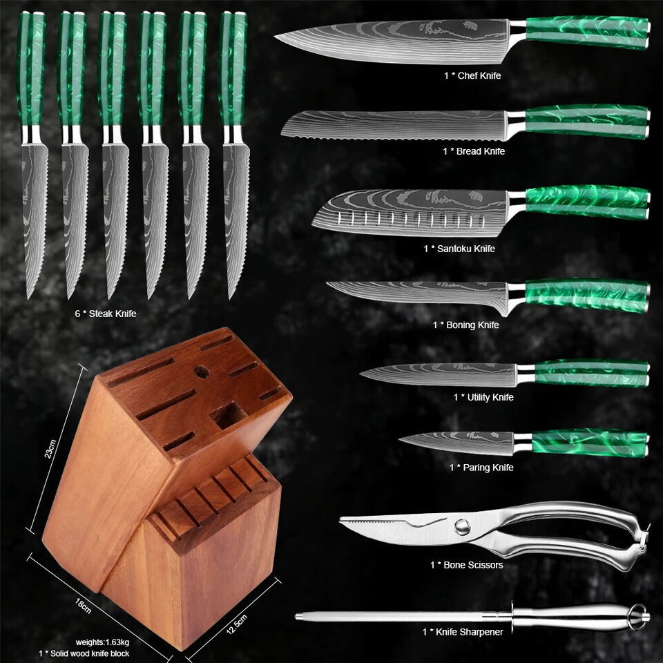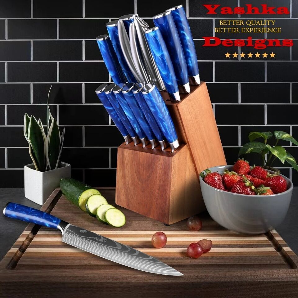 15-Piece Chef Knife Set Sharpening Rod Wooden Block Kitchen Scissors Blue Green