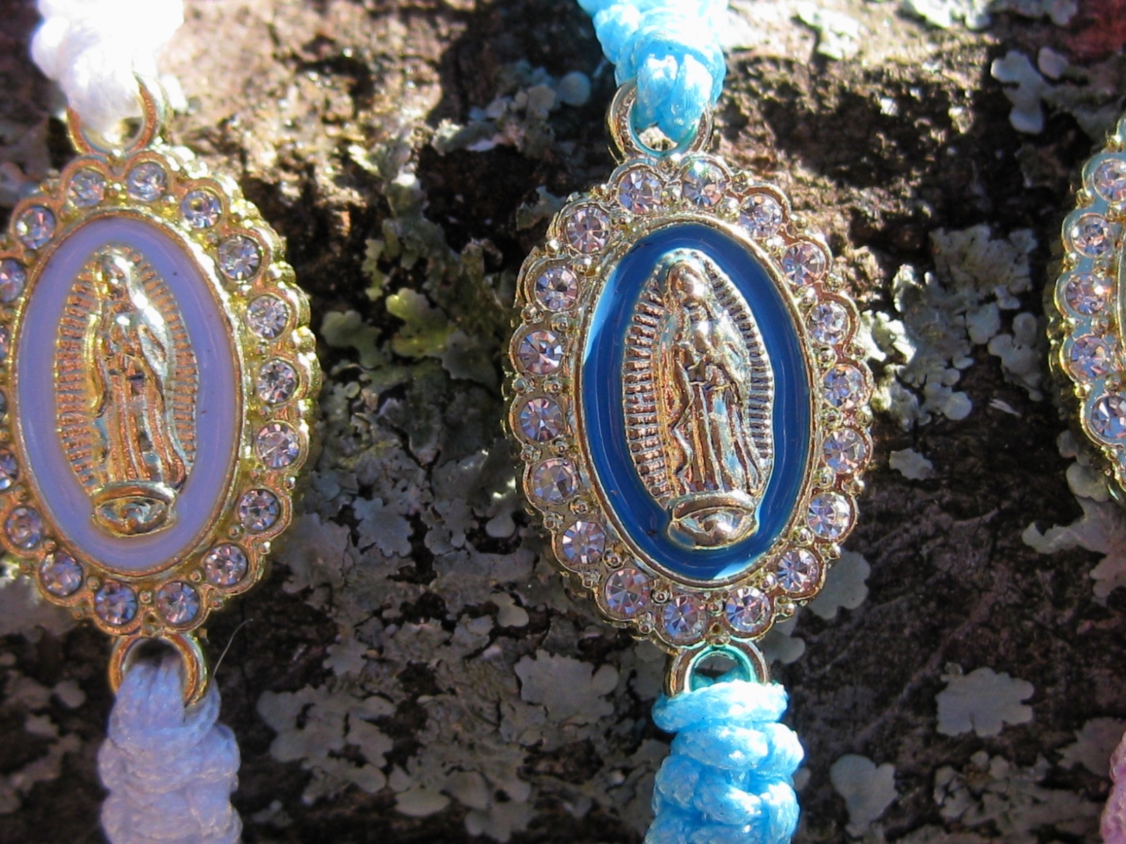 Bracelets are braided adjustable cord with the image of the Lady of Guadalupe in the center surrounded by rhinestones. Unisex.