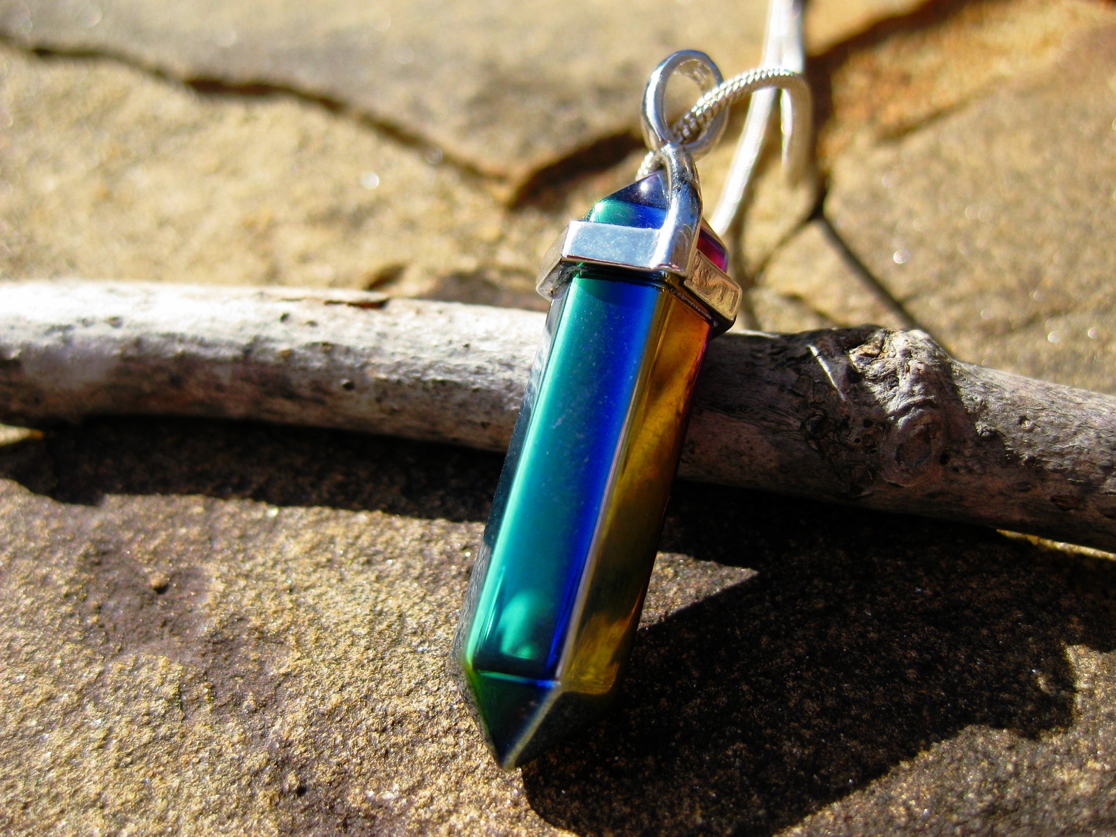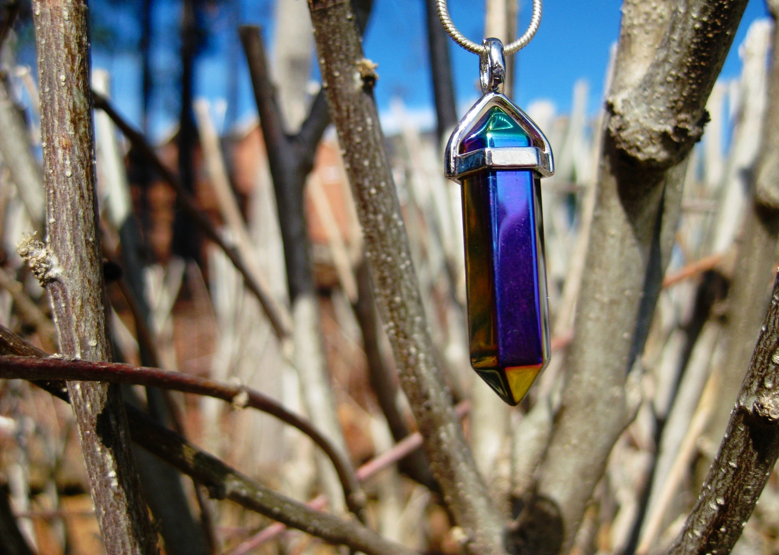 The pendant is amazing and will gain you many compliments. It is a unique multi colored point that changes colors with your movements. No two are alike. It comes with a chain for wearing.