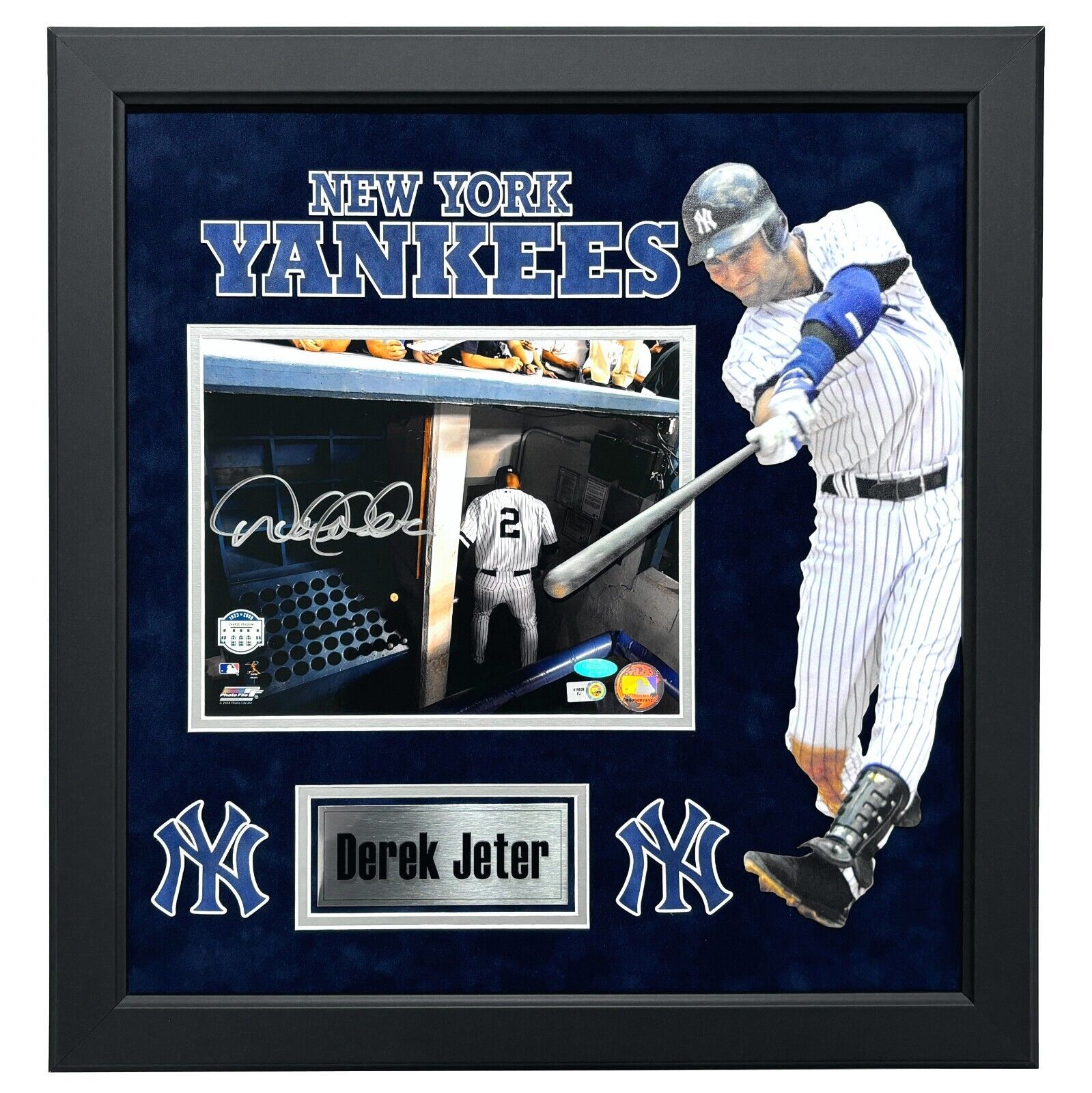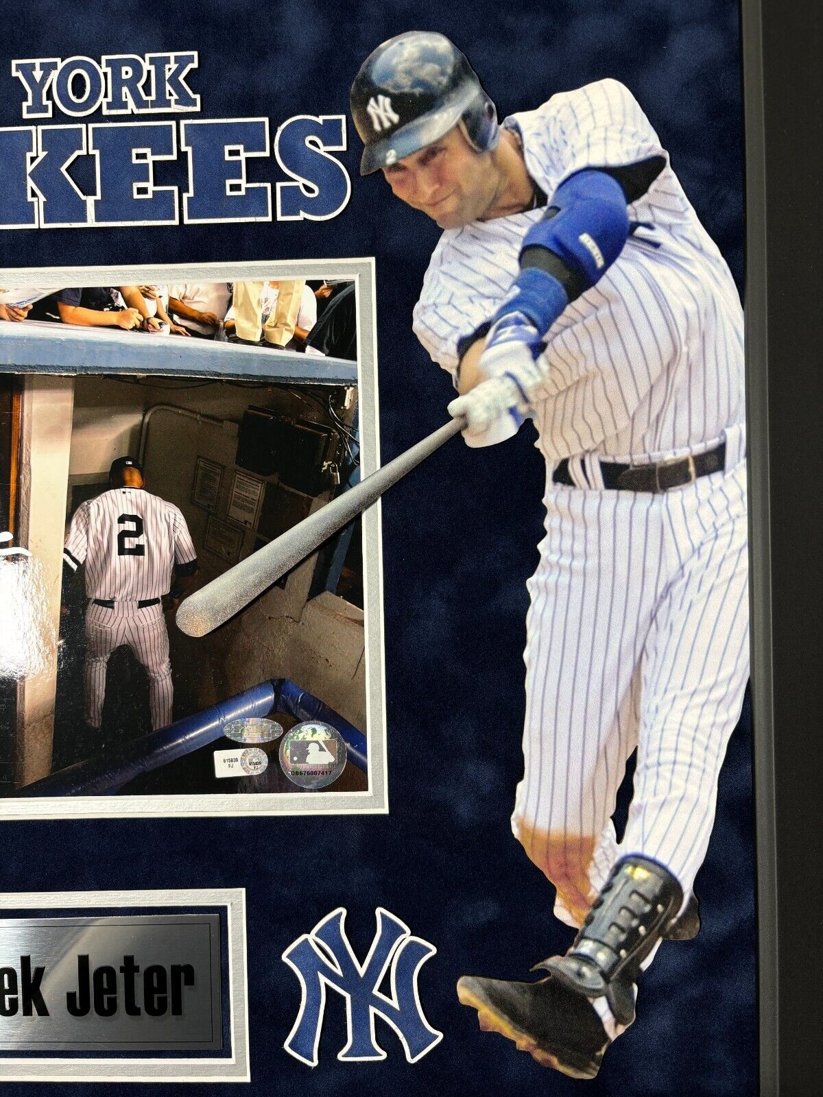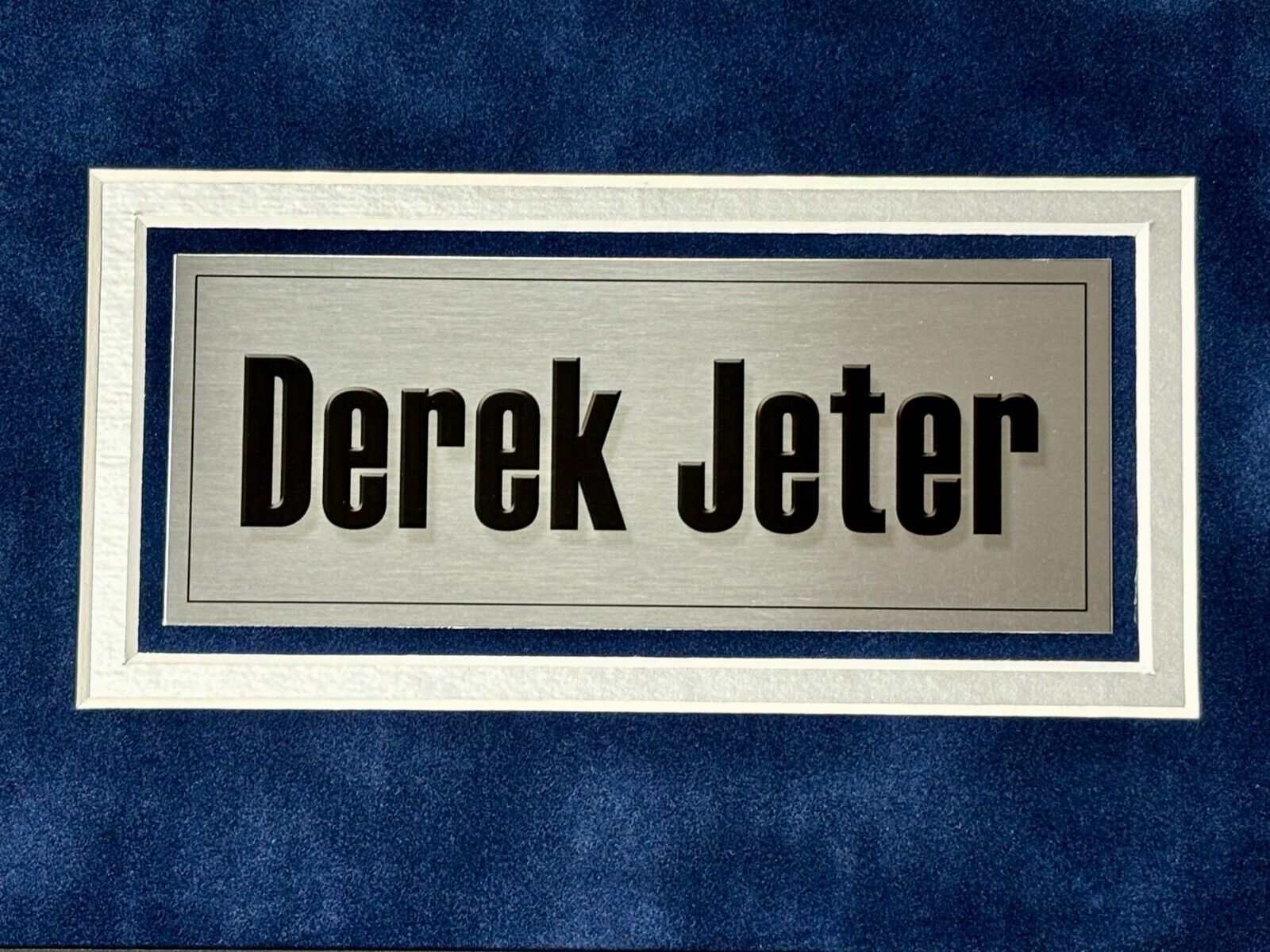If you are looking for a high-end frame, well this piece is as high end as it gets. This item is professionally museum quality custom framed in a black frame that features double matting with a navy blue suede top mat as well as a plexiglass display and a nameplate depicting his name on it! The graphics and logos on this piece are literally second to none where all the Yankees logos, wording and Derek Jeter's image are all laser cut onto the mat! Wow!! This frame measures approximately 33" x 23".
