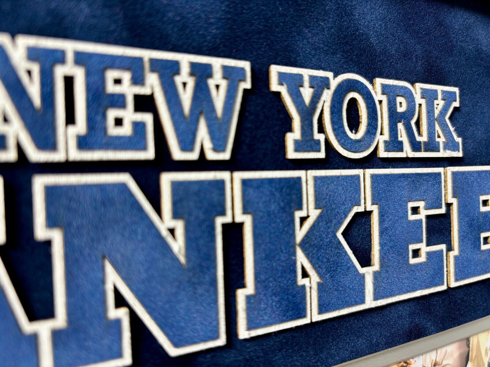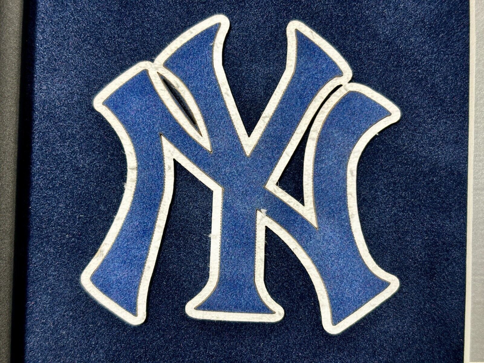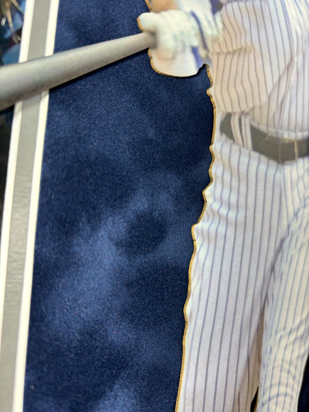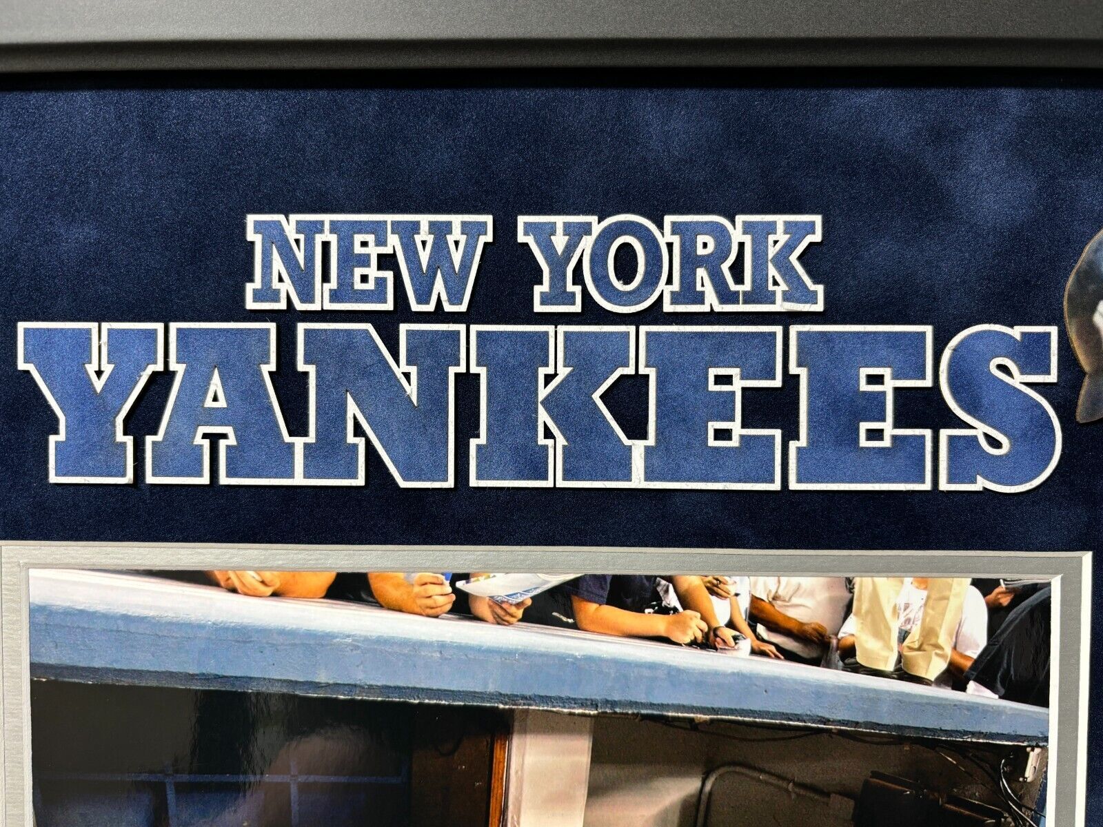 If you are looking for a high-end frame, well this piece is as high end as it gets. This item is professionally museum quality custom framed in a black frame that features double matting with a navy blue suede top mat as well as a plexiglass display and a nameplate depicting his name on it! The graphics and logos on this piece are literally second to none where all the Yankees logos, wording and Derek Jeter's image are all laser cut onto the mat! Wow!! This frame measures approximately 33" x 23".