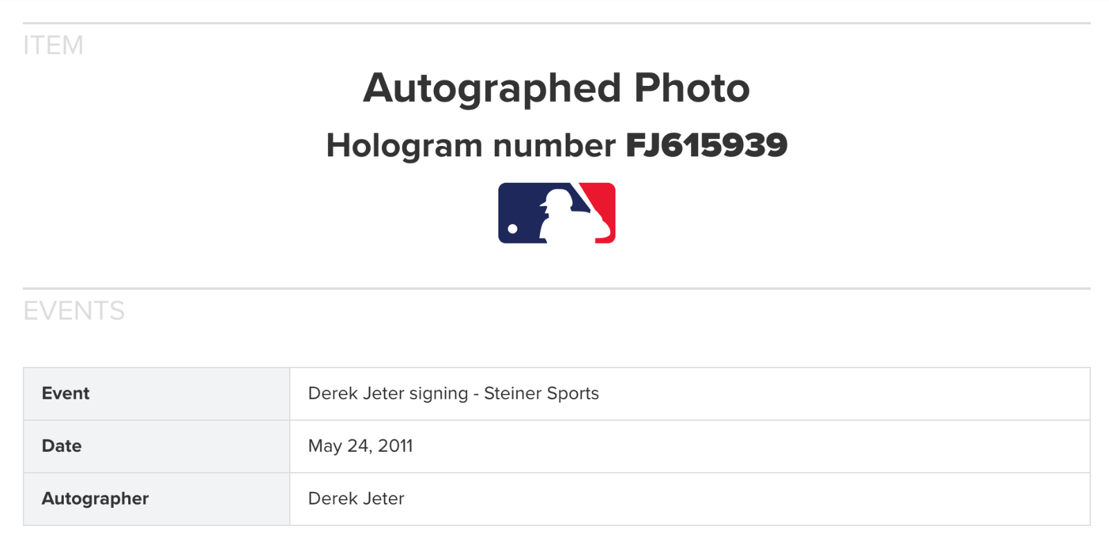 This item has been certified authentic by two of the most reputable and recognized authenticators in the business today, MLB Authentication Steiner Sports. MLB Authentication is the actual MLB league authenticating the signature, guaranteeing it's real from them. You can go on MLB's authenticity verification database, type in the number seen on the hologram #FJ615939 and up will pop the COA hologram verifying the league authentication it as well. Derek was a contractual exclusive autograph signer for the company in 2011 when he signed this photo meaning you could only get his guaranteed authentic signatures of his through Steiner Sports in which you see their Certificate of Authenticity hologram affixed to the photo at the bottom right-hand corner.