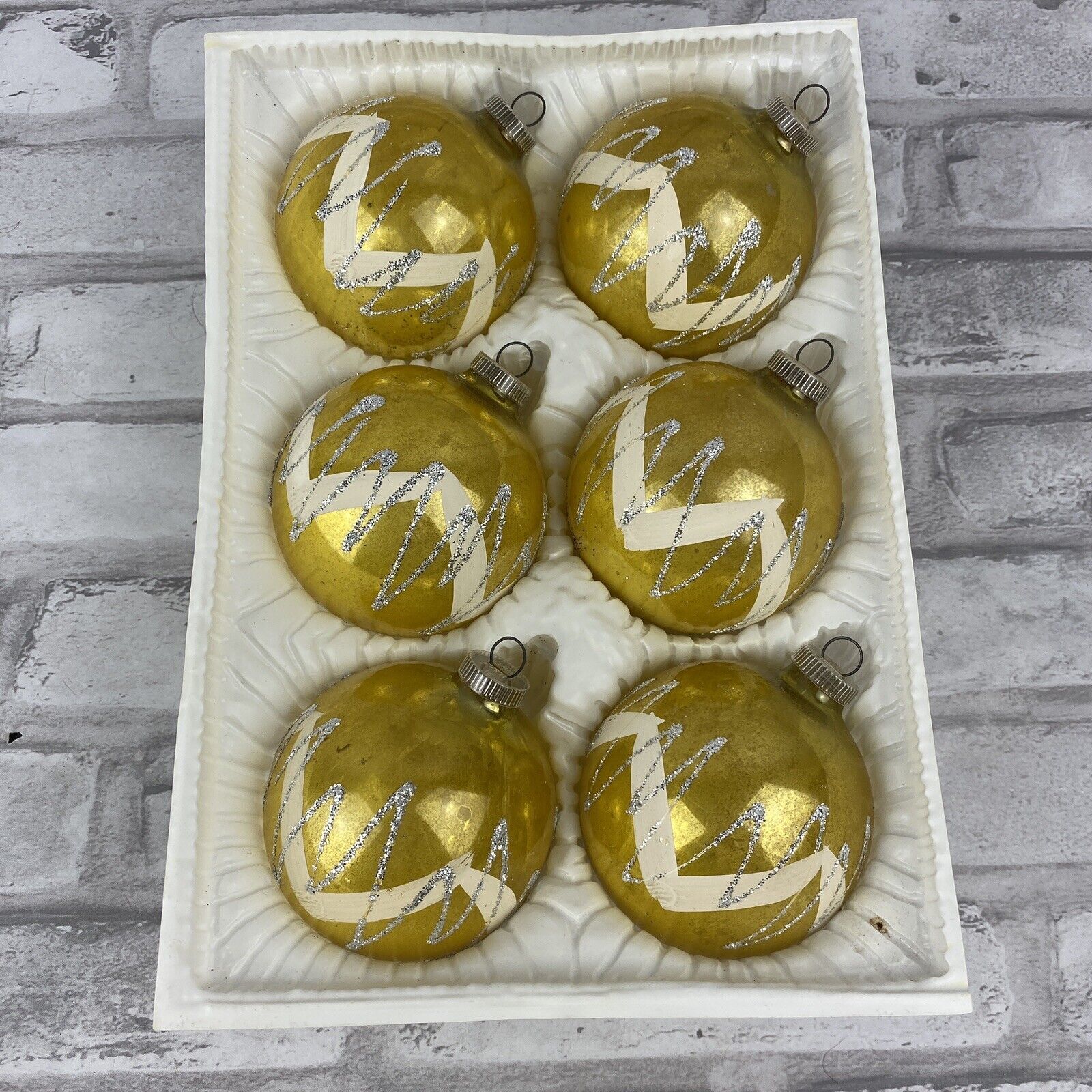 West Germany DBGM Christmas Ornaments Gold White Zig Zag Silver Glitter Vintage
