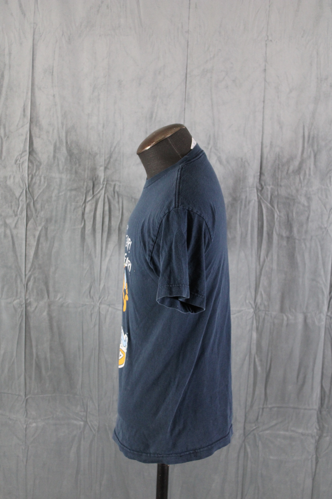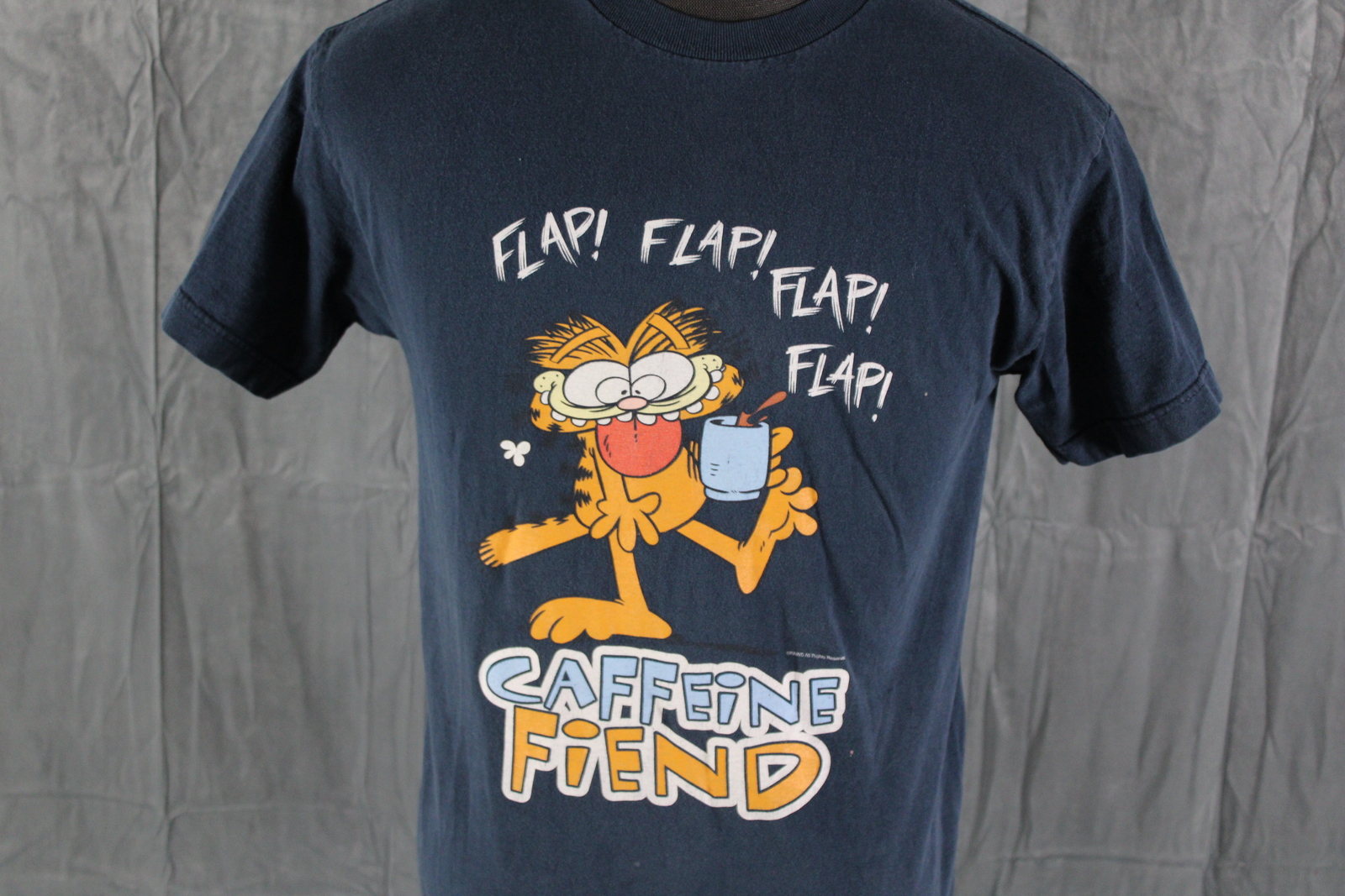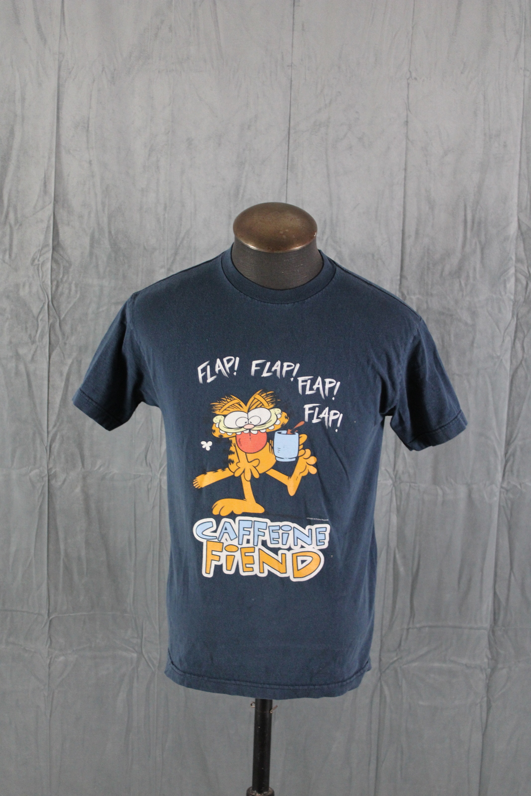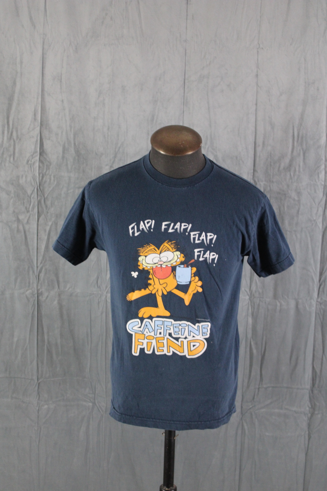 Up for sale is a retro Garfield shirt. It has a dark blue base colour. The graphic on the shirt features an image of Garfield with a coffee mug in hand with caffeine feind underneath. What a great vintage shirt do not miss out on it.