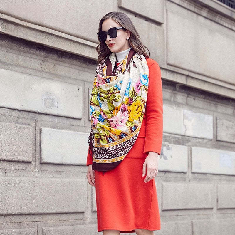 Anyyou 100% Merino Wool Multi Pattern Dark Brown Silk Satin Large Winter Scarf