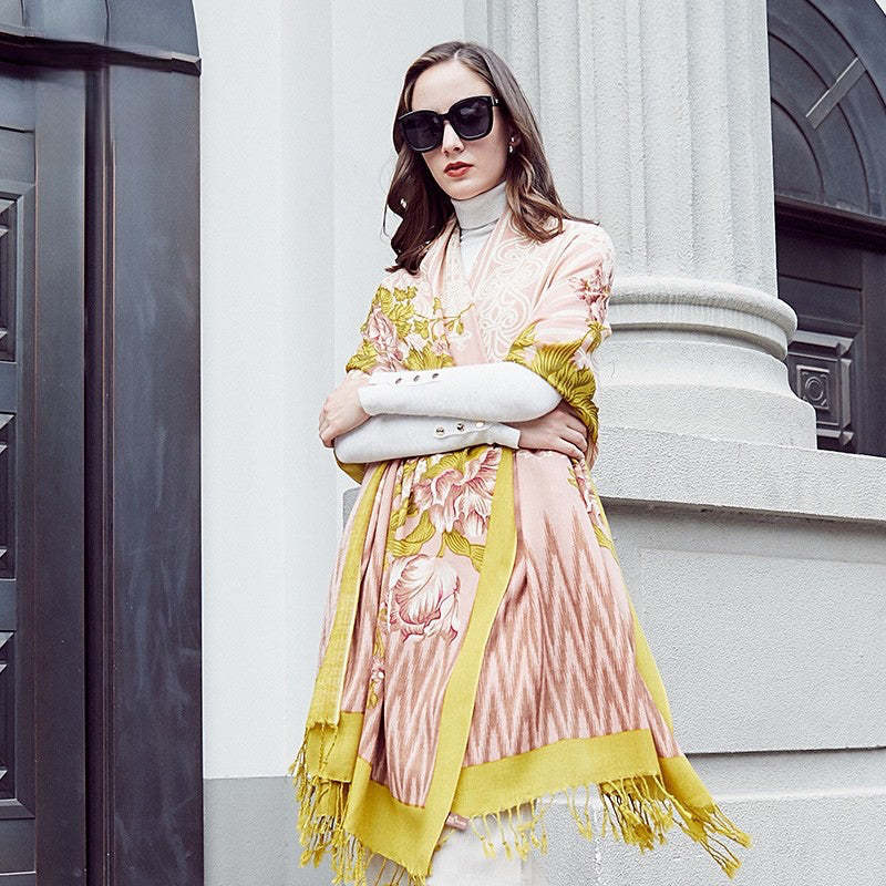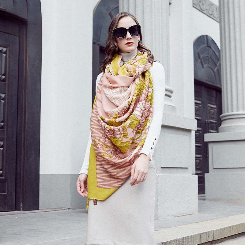 Anyyou 100% Merino Wool Yellow Pink Elegance Neck Silk Satin Large Winter Scarf