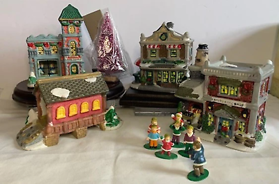 Cobblestone Corners Christmas Village set includes 4 buildings 4.5" to 5.5", covered bridge 3.5" tall, tree 5" tall, and figures1.5". Boxes cords not included.
