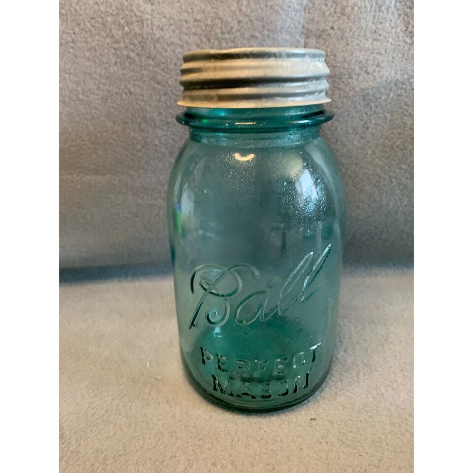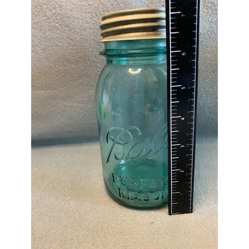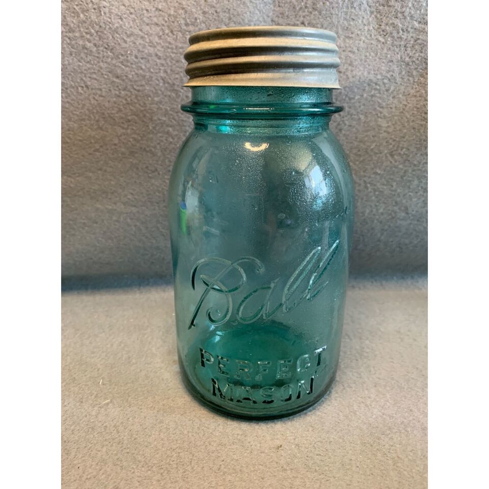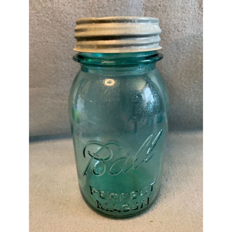 This beautiful Blue Ball Perfect Mason Canning Jar with Zinc Lid #8, by Ball, is a half-gallon size. The glass jar is in excellent condition, with no chips or cracks.