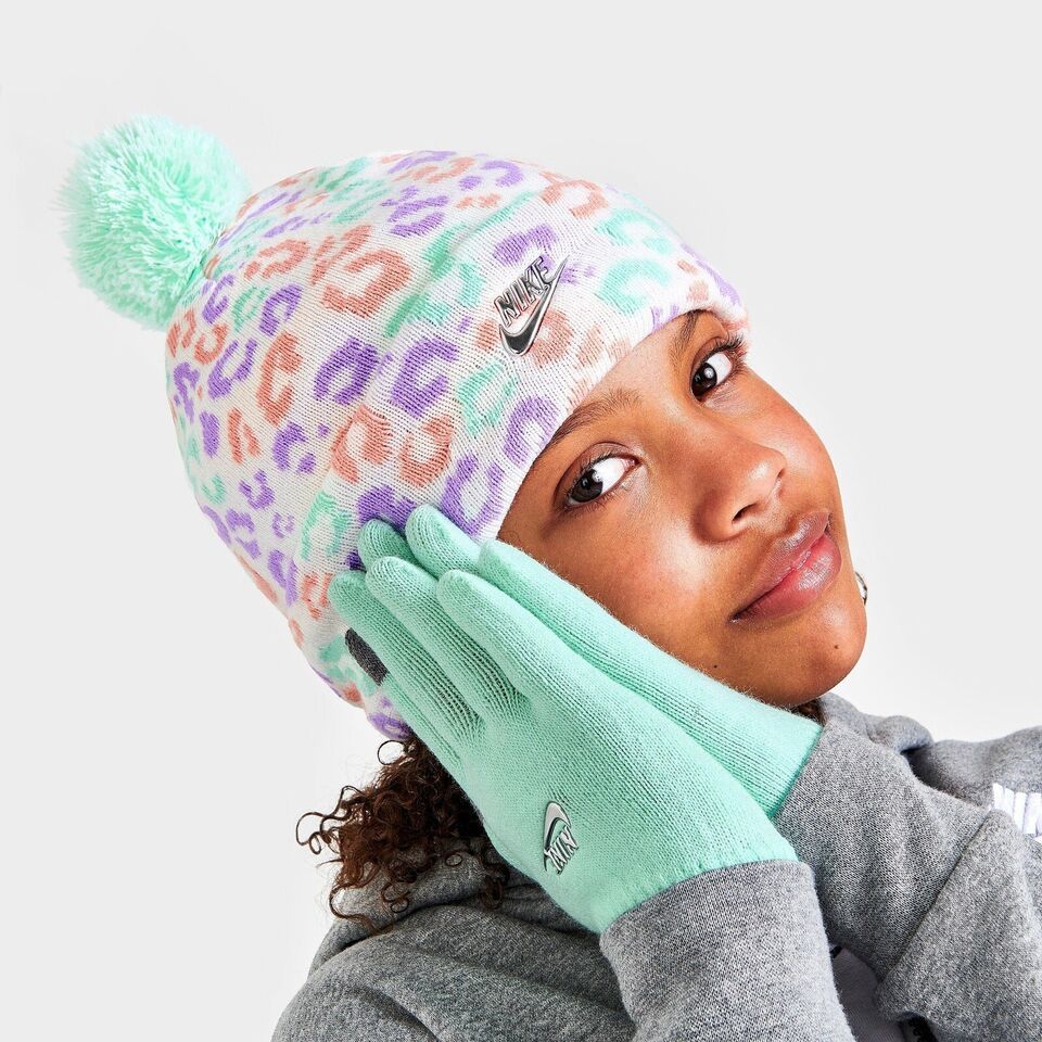 Brand New Girls' Toddler Nike Leopard Print Beanie and Mittens Set Multicolored
