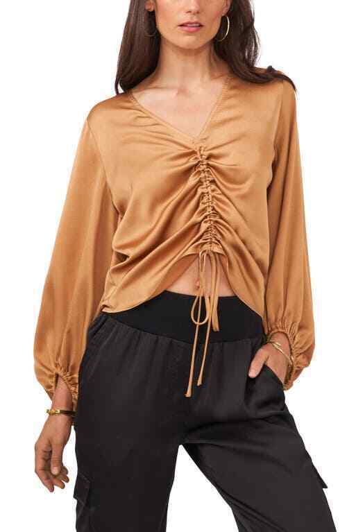 A ruched center lets you cinch the fit of this beguiling blouson-sleeve top in a shimmering textured crepe. 100% polyester Hand wash, dry flat Imported