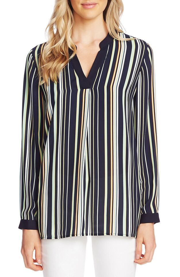 A split-neck georgette top with a flowy front pleat comes with a colorful barcode pattern that's utterly eye-catching from the office to Sunday brunch. Style Name: Vince Camuto Waterlake Stripe Split Neck Top. Style Number: 5935975. Available in stores.