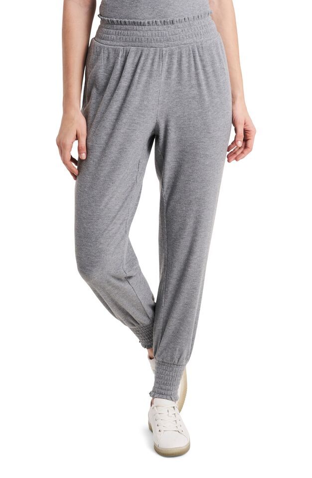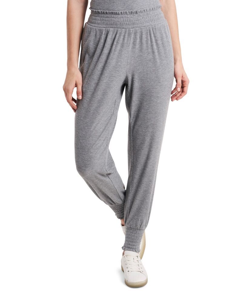 Smocked frill at the waistband and cuffs adds a cute touch to these comfy and cozy rib-knit joggers that are ideal for your off-the-clock style. 29" inseam; 9" leg opening; 11 1/2" front rise; 15 1/2" back rise Elastic waist Side-seam pockets 62% polyester, 33% rayon, 5% spandex Machine wash, tumble dry Imported Women's Clothing