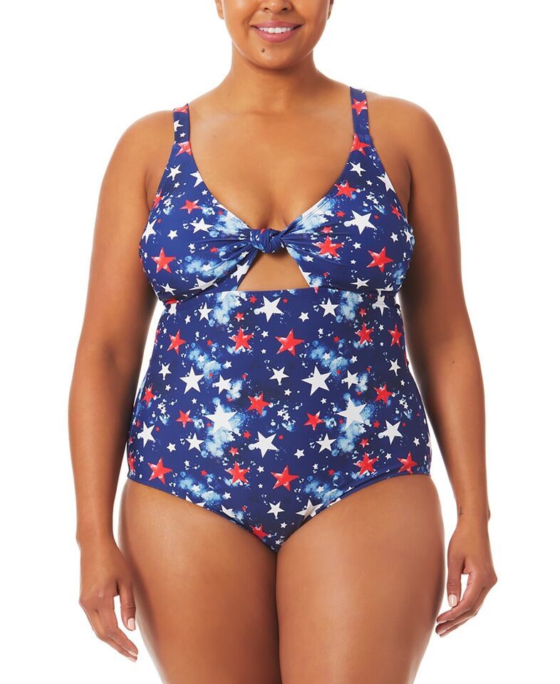 You'll be swimming in compliments in this plus size swimsuit from California Waves, a one-piece pick designed with cutouts and a playful print.