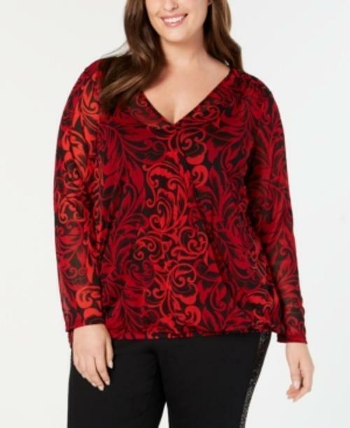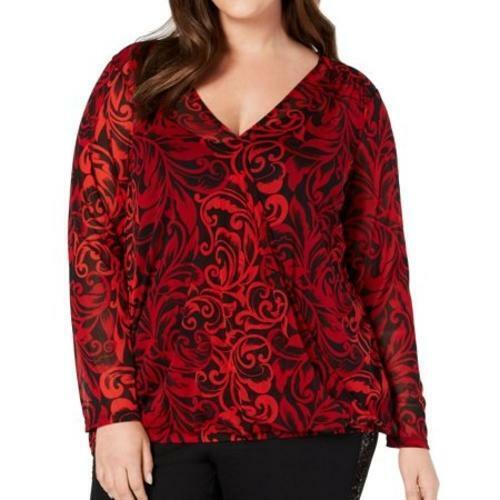 MSRP $70 Womens Blouse Plus Surplice Scroll Print Sheer Illusion Red Size 0X