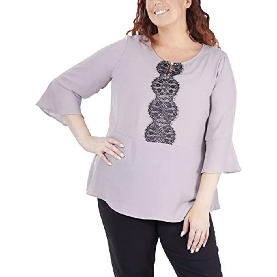 $48 Women's Plus Size Bell Sleeve Peplum Top with Lace Trim Gull Gray Size 2X