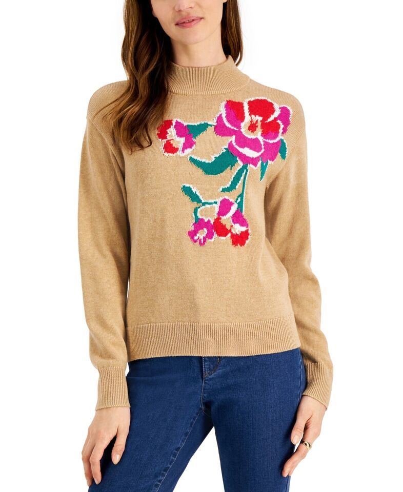 The eye-catching floral design on this Charter Club mock neck sweater brings a pop of color to your wardrobe while the positioning of the design draws attention up towards your face to ensure all eyes are on you. (Clearance)