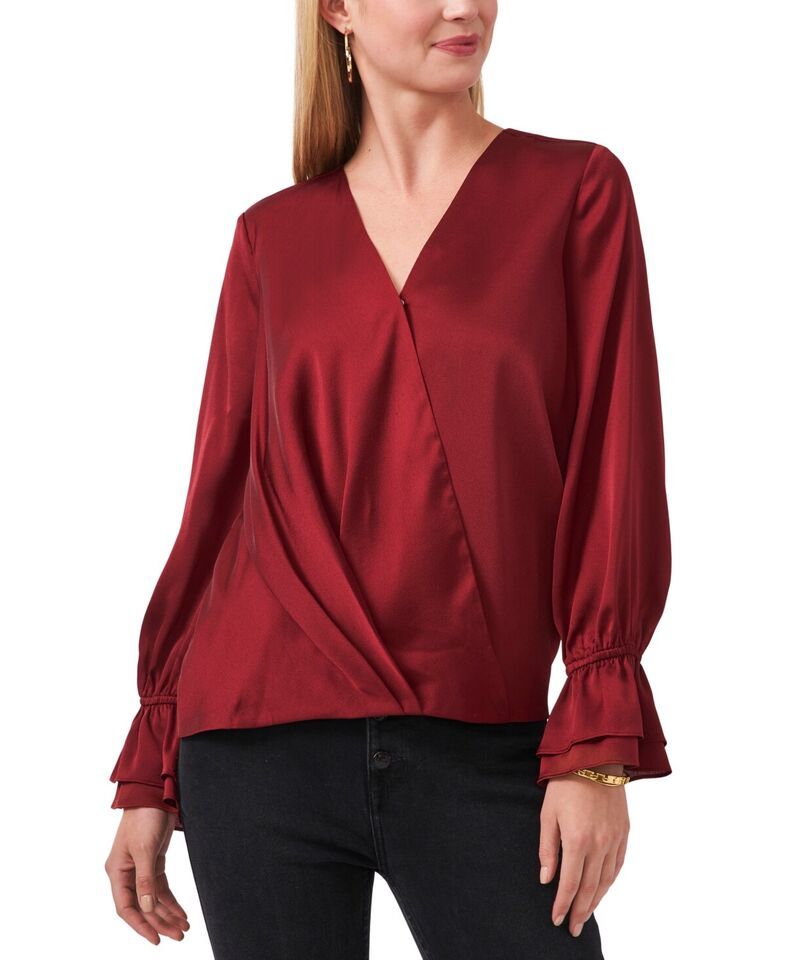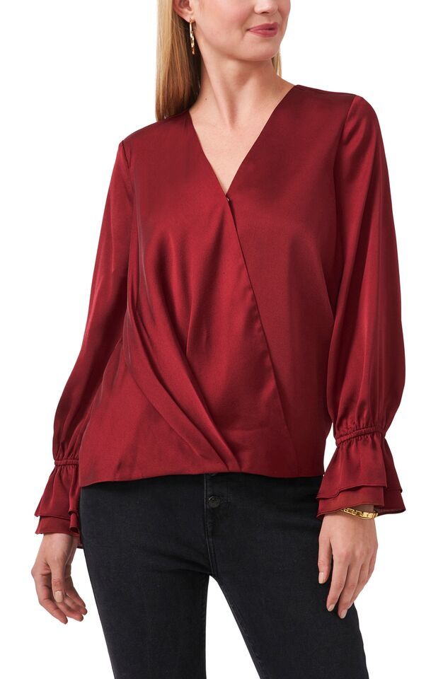 A double row of ruffles decorates the gathered cuffs of this night-out blouse, done in all your favorite colors in a gracefully wrapped silhouette. 25 1/2" length Slips on over head Surplice V-neck Long sleeves with elastic cuffs 100% polyester Machine wash, tumble dry Imported Women's Clothing