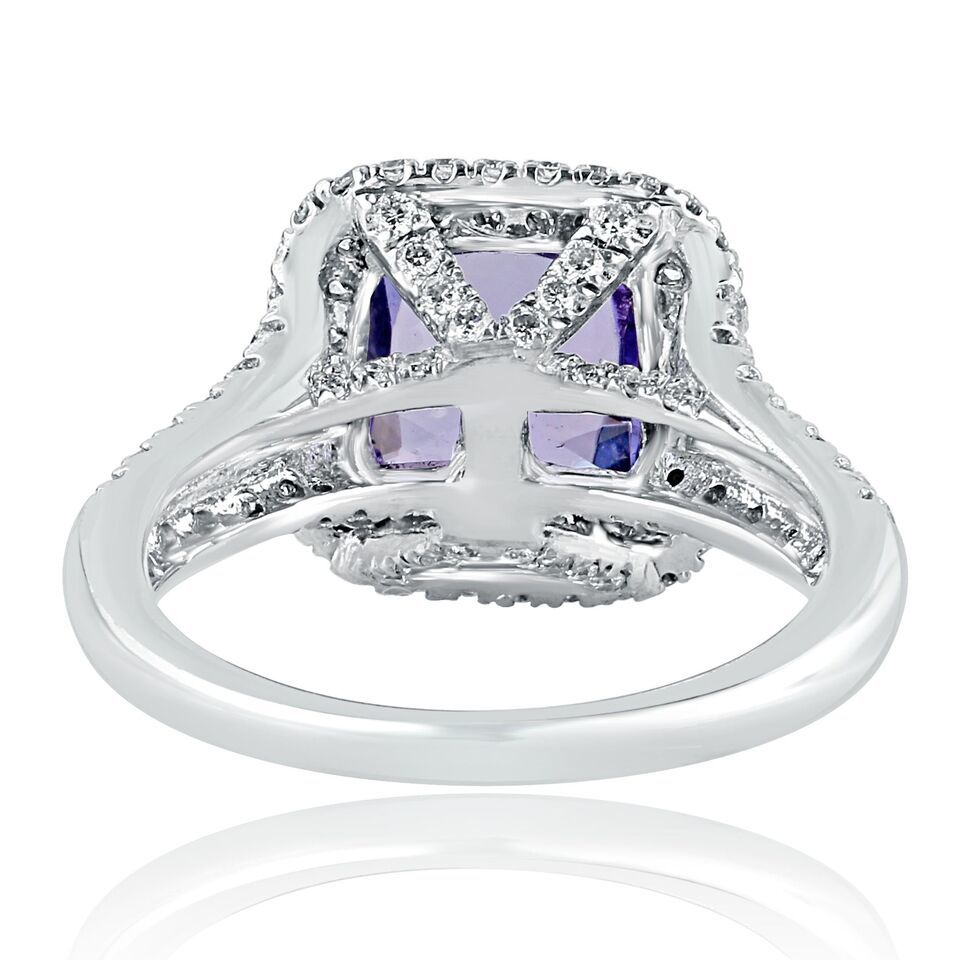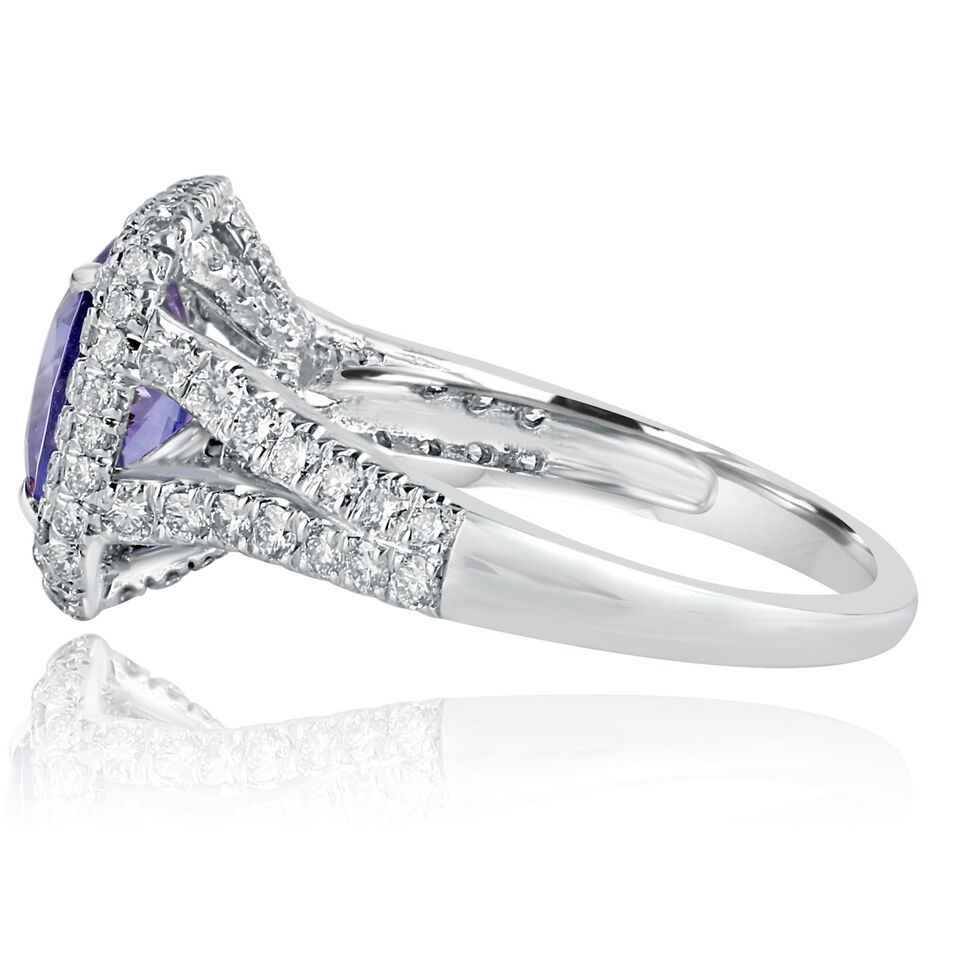 A 2.04 carat cushion cut tanzanite is the centerpiece of this split shank engagement ring, studded with micro pave set round cut colorless diamonds. Additional diamonds line the shank adding an extra beauty to the ring. Handcrafted in 18-karat white gold.