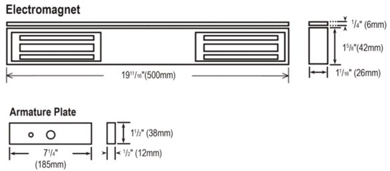 Electromagnet dimensions: 19-11/16" x 1-5/8" x 1-1/16" (500 x 40 x 26 mm)