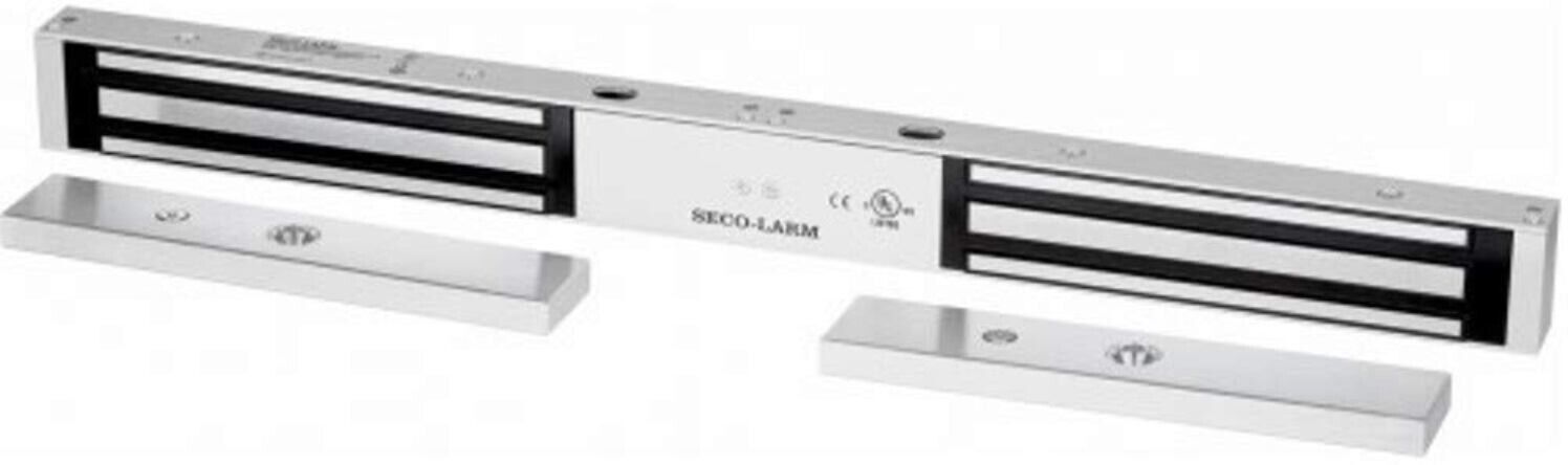 Seco-Larm E-941DA-600PQ Electromagnetic Lock, 600-lb (272kg) Holding Force per Door, Double-door, Built-in Bond Sensors with 3A@12VDC Dry Relay Output for Monitoring Door Status, Built-in Status LED Shows Locked/Unlocked Status, No Residual Magnetism, MOV Surge Protection, Anodized Aluminum Housing (US 28), Adjustable Mounting Bracket, Detachable Faceplate for Easy Access to Wiring, 12/24VDC Selectable, UL Listed