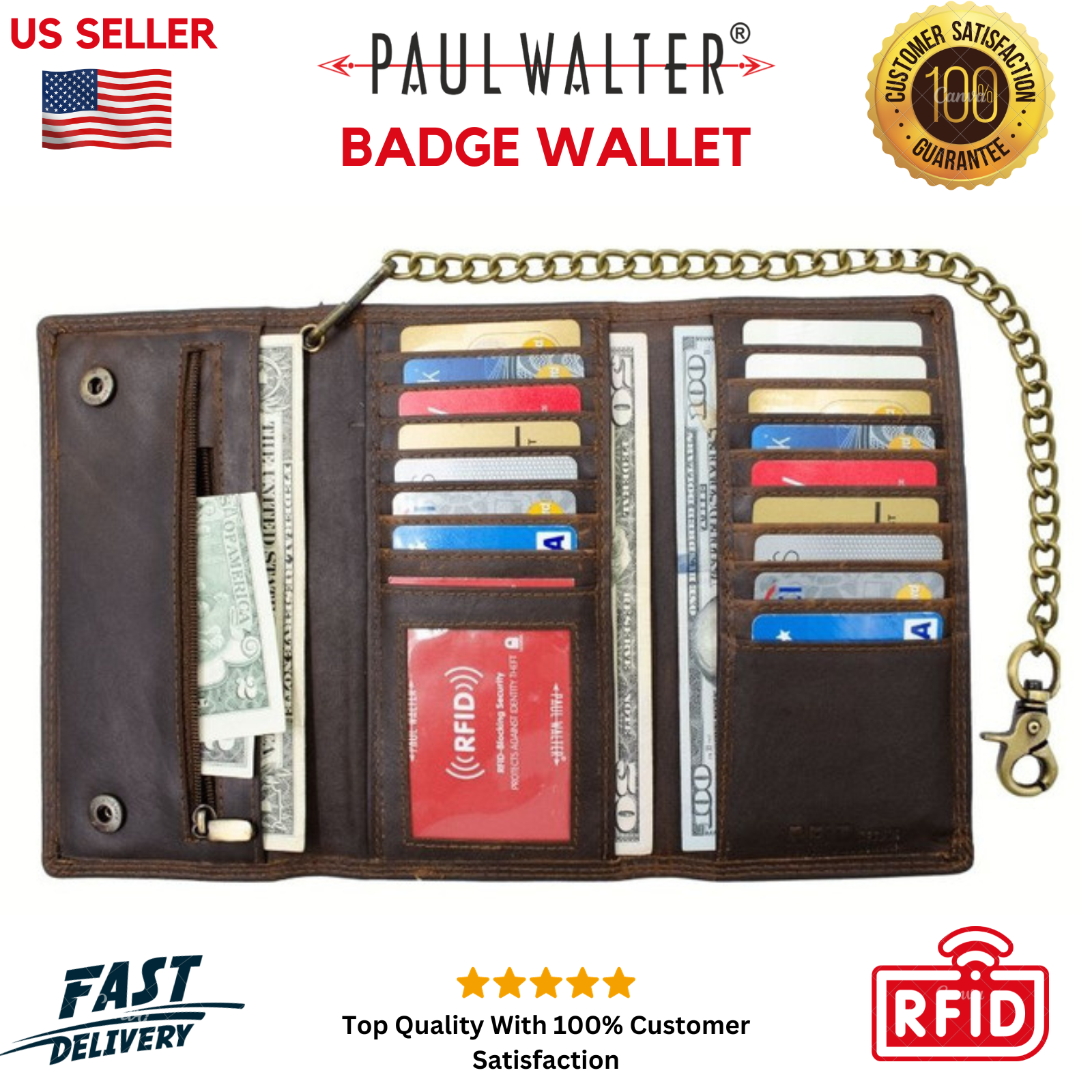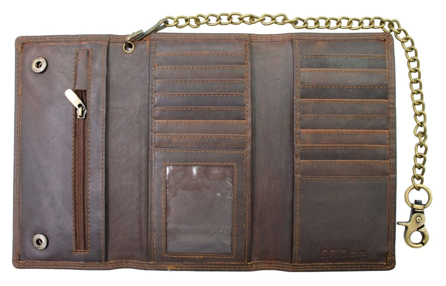 HIGHLIGHTING FEATURE : It has 3 Note/Checkbook Compartment, 16 card slots, 1 Transparent window for license or ID card, 1 Zippered Coin Pocket, Long Antique Chain 12 inch approx.