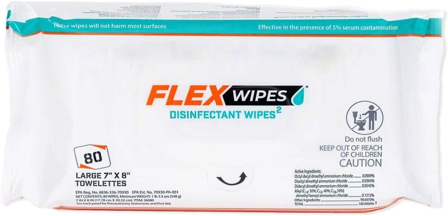 FLEXWIPES Disinfectant wipes are a heavy duty disinfectant wipe that cleans, disinfects, and deodorizes in one labor-saving step. Our convenient 80 count soft packs of durable 8" x 7" wipes is designed to disinfect and clean most surfaces. EPA registered to kill over 40 pathogens. FLEX WIPES are produced in the USA using the highest quality components to deliver best-in-class performance. Our advanced formula is bleach and phenol free making it safe for all non-porous hard surfaces. Starts killing bacteria on contact Kills 99.9% of bacteria in 15 seconds. Kills MRSA, E. Coli, Herpes, Influenza and more... Proudly made in USA. Quality guaranteed Proven "one-step" disinfectant-cleaner which is effective in the presence of 5% serum (bodily fluids) contamination.
