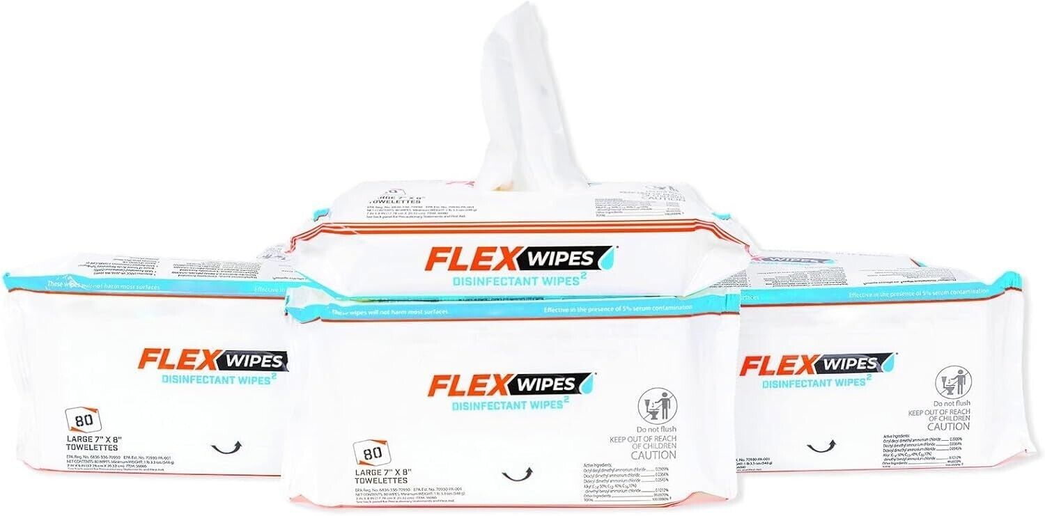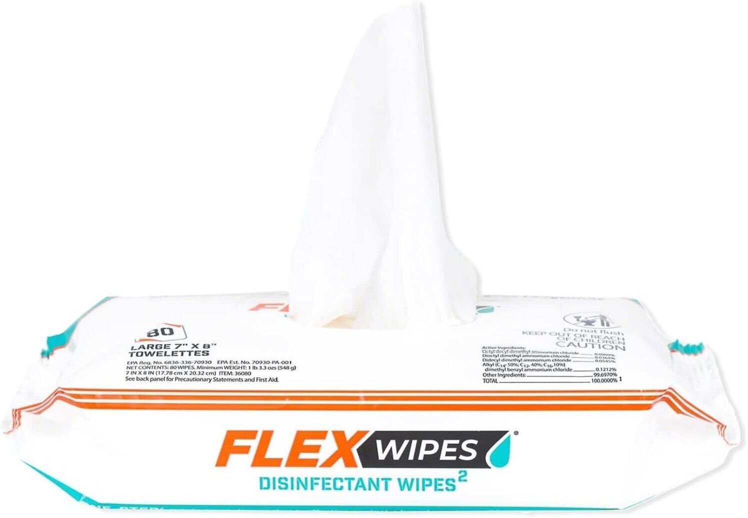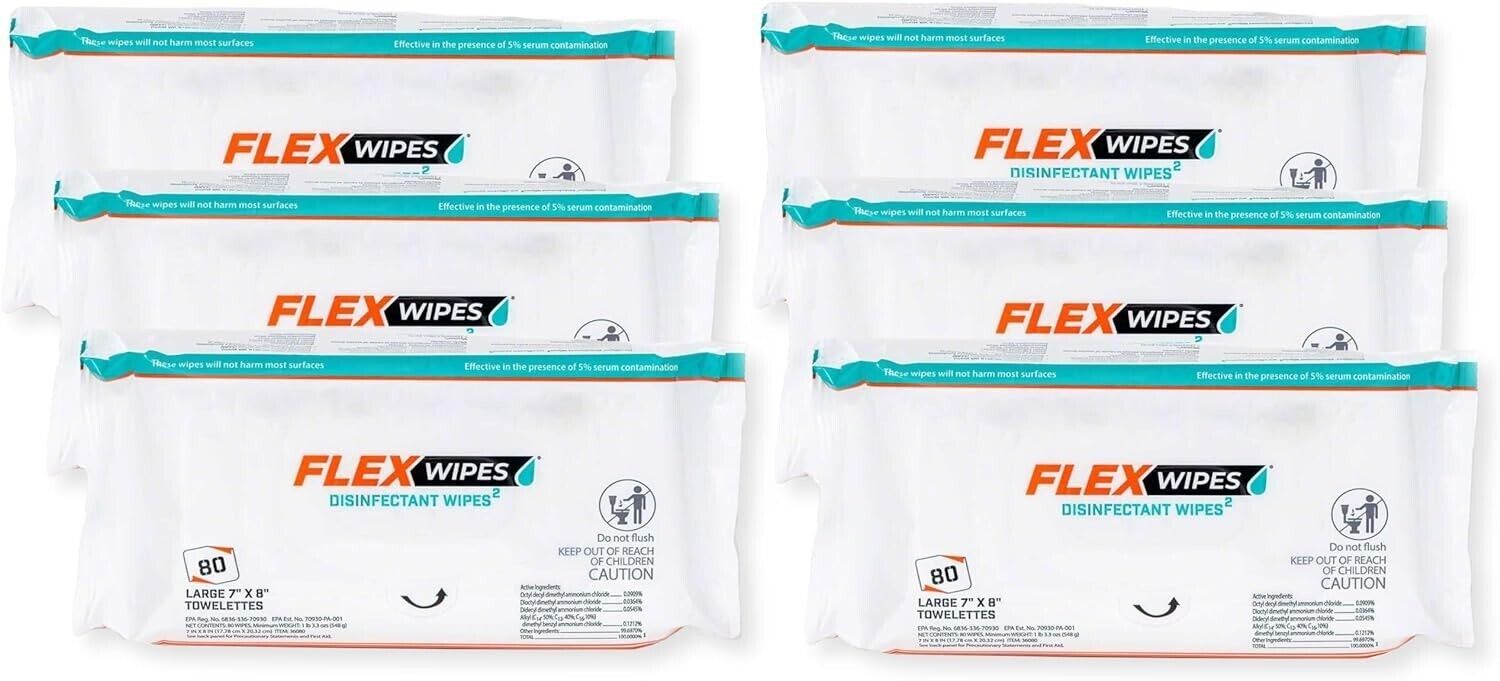 FlexWipes 36080 Disinfectant Wipes (Pack of 6); Large 7" x 8" Wipes, 80 Wipes Per Pack, Dispenses One at a Time; Heavy Duty Disinfectant Wipe That Cleans, Disinfects, and Deodorizes in One Labor-saving Step; Starts Killing Bacteria On Contact; Kills 99.9% of Bacteria in 15 Seconds; Convenient Packaging That's Easy to Travel With or Stow in a Drawer or Glove Box