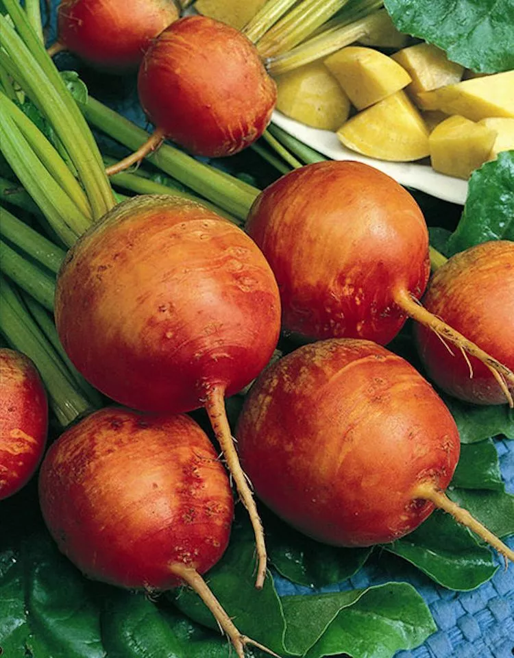 Golden Detroit beet features round, orange roots that turn golden yellow when cooked. Golden Detroit does not bleed, roots grow fast, retains sweet flavor when quite large and is excellent for pickling. Very tender and mild. 55 days.