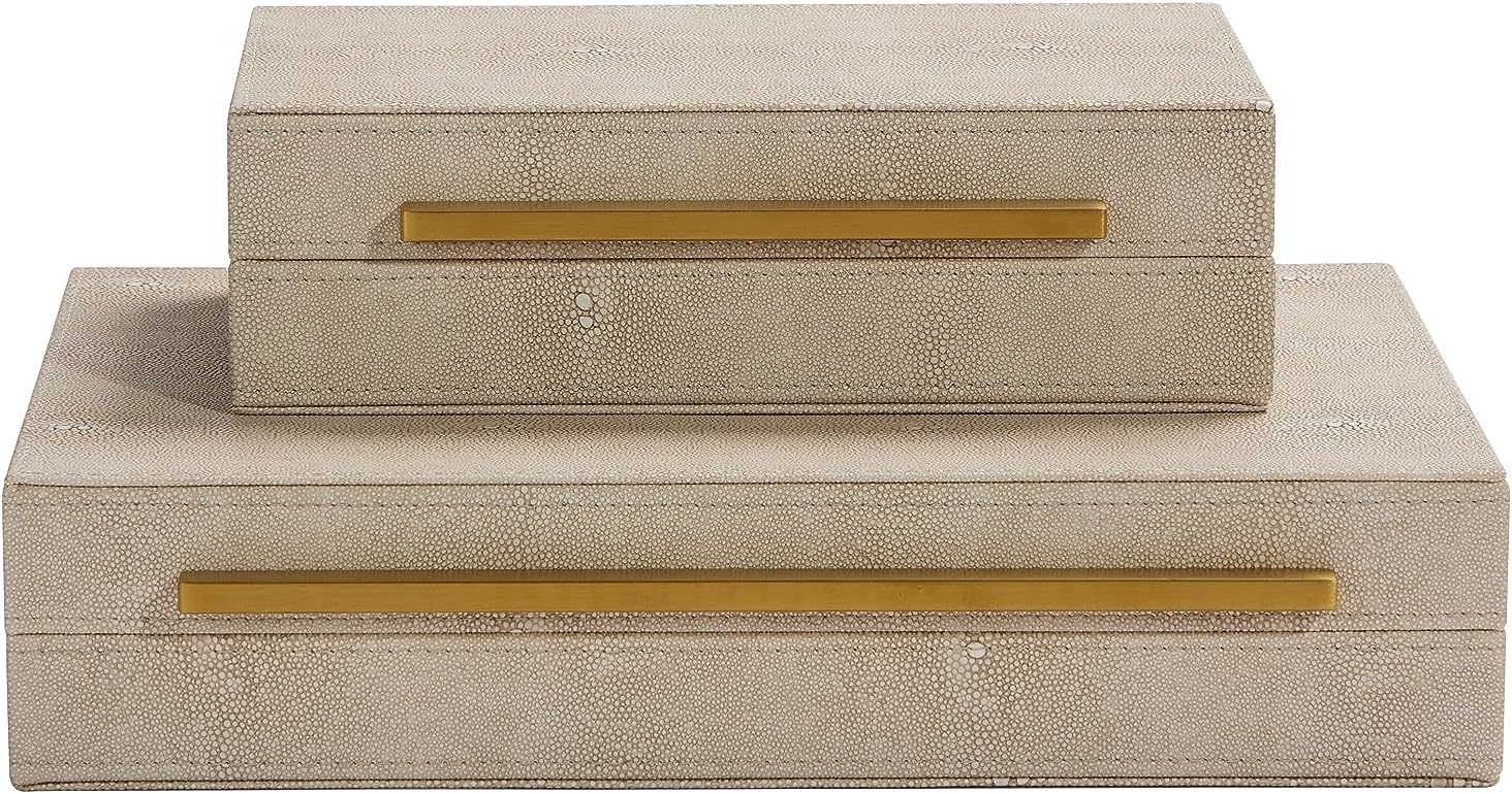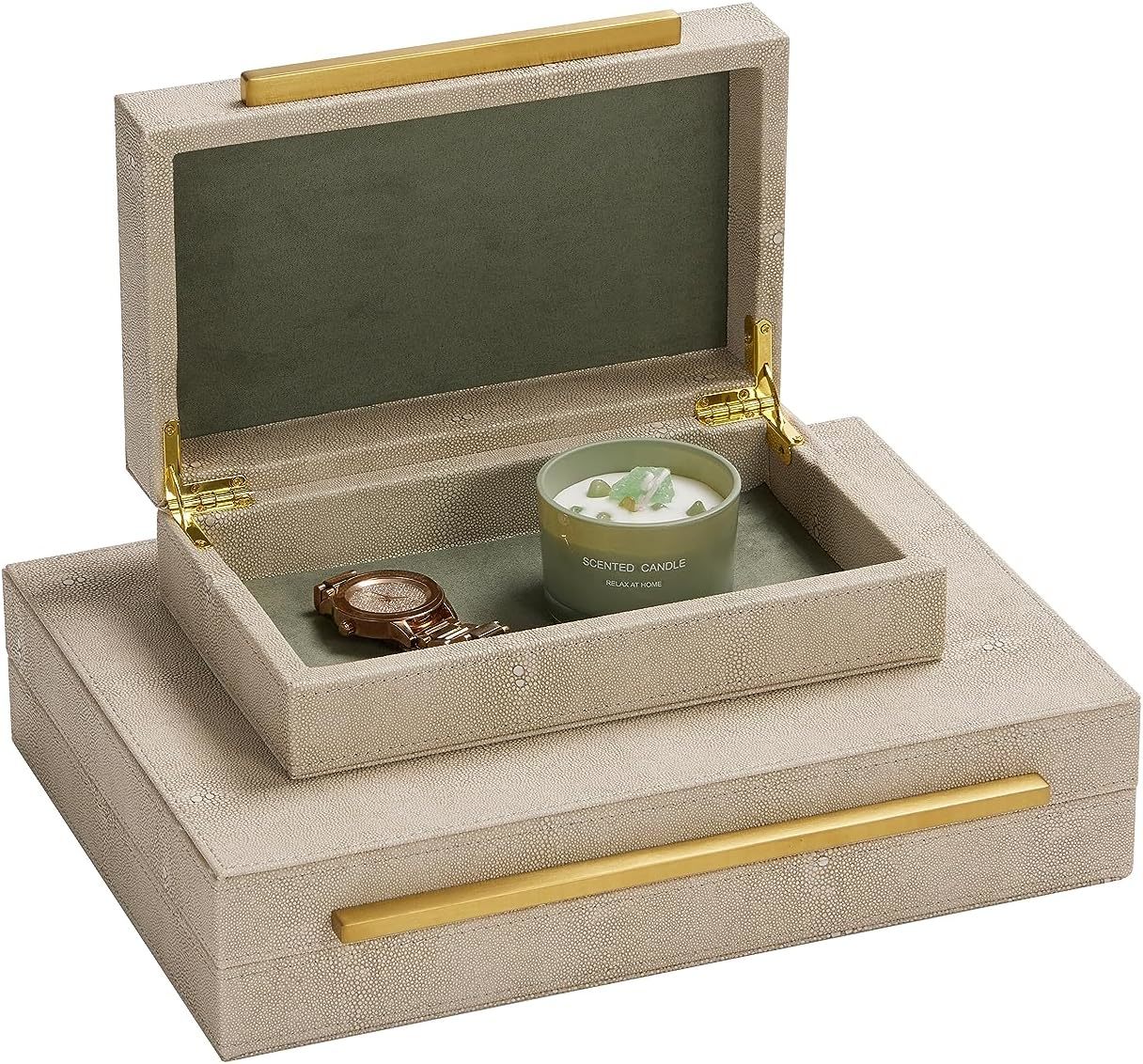 Stylish and Elegant Design ! This eye-catching decorative box boasts and elegant blend of ivory and gold, a unique brushed gold metal handle for effortless opening and closing. It is Beautiful and Modern home decor wherever you put it on the coffee table, side table, console table, night stand, shelf, book case, barthroom.2pcs of pack can be stacked piece by piece on your book shelf or console table or any other placed your liked. Multipurposed Storage Box: This storage box is used for many different purposes such as decorative box, shelf organizer box, storage box, keepsake and memory box, photos box, jewelry box, desk accessory organizer, Women and men's accessory box. Strong and Protective! With a robust MDF frame and smooth suede lining, the home organizer box offers good protection for all of your cherished accessories such as remotes, glasses, wathces, stationery, keys, , shielding them from dust and scratches and it also helps to classify your make-up perfume, watches, keys, soap, sunglasses,remote control, charger, necktie,socks, underwear to make your home tidy and nicely Ideal Gift: The lovely box is wonderful gift for your loveed ones on special occasions such as birthdays, anniversaries, thanksgiving,Chirtmas. Large rectangular shaped stoages- The size for large box: 13.8*9.8*2.8 inch, the size for small box: 9.8*5.9*2.8 inch.