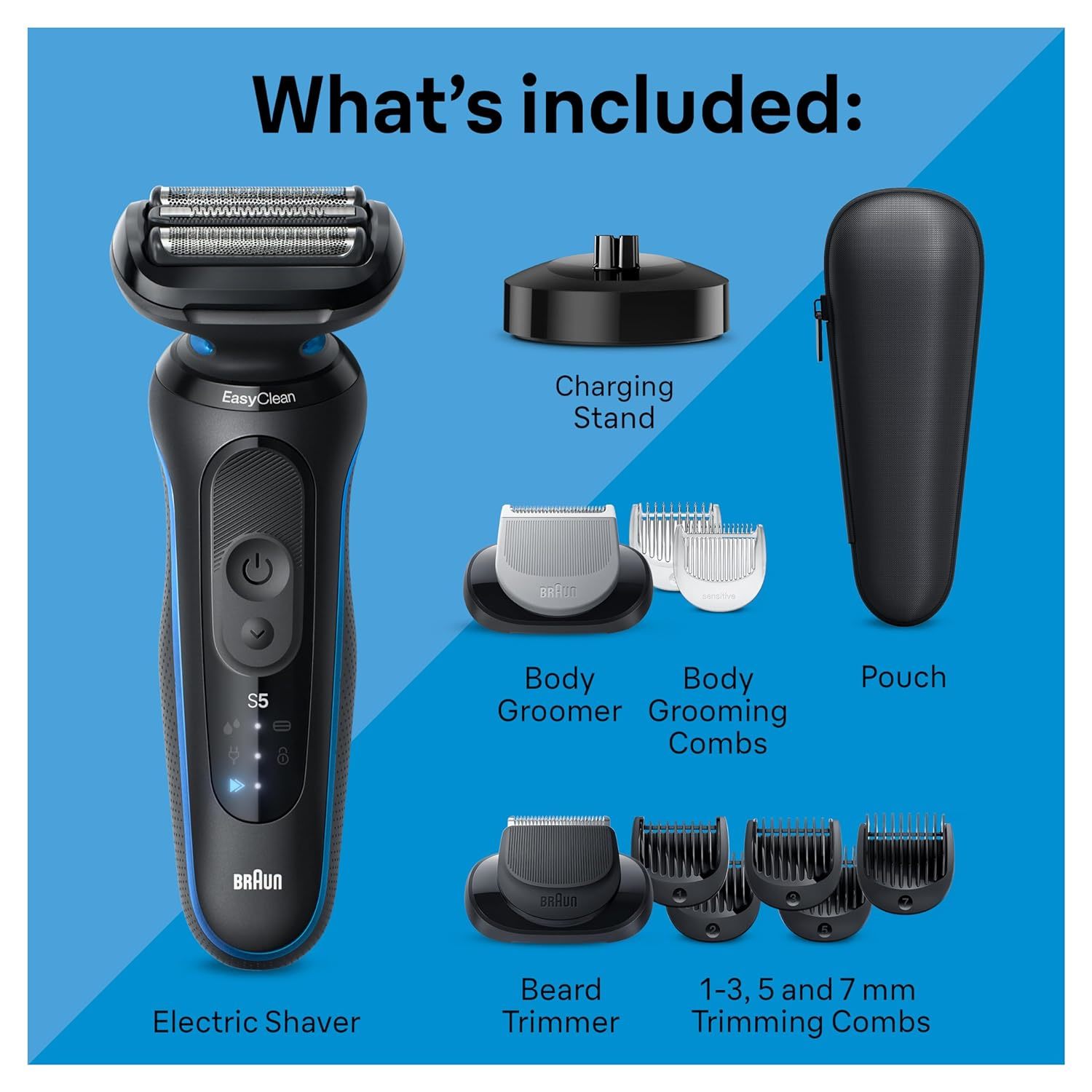 CLEAN AND FAST SHAVE: Braun Series 5 Shaver for a clean and fast shave. Comfortable on your skin 3 FLEXIBLE BLADES: The shaver adapts to your unique face contours to deliver a close shave while also protecting your skin 2 SHAVE MODES: now with Standard and Turbo mode for an extra fast shave with up to 25,500 cutting actions per second BUILT TO LAST: Engineered in Germany, Wet Dry use, up to 50 min Li-Ion battery time INCLUDES: Body Groomer, Beard Trimmer EasyClick attachments, and Charging Stand