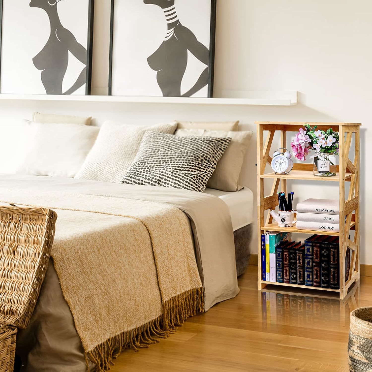 Hedume bookcase is multipurpose storage shelf. The size is 16(W) x 9.7(D) x 30(H) inches. It's not only a bookcase but also an end table, night stand, bathroom shelf and display shelf. Natural bamboo design to fit into any room. Display some plants on it to liven up your room. Mission-style H sides and open back offer light, airy look. Place the bamboo table to bathroom as bathroom storage shelf rack to organize some shampoos, cosmetics and laundry. With 3 shelves storage space, large enough to hold some items in need. Easy assembly for such a small bookcase, read the instruction before installation, just follow and put them together step by step, then a durable and sturdy shelving unit will get after fully assembled.