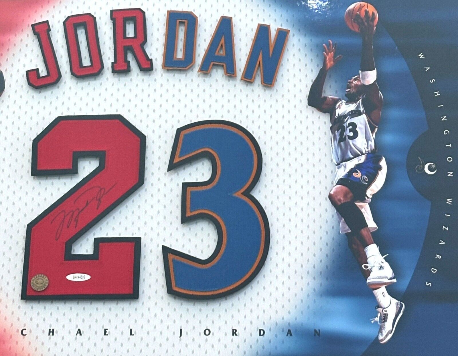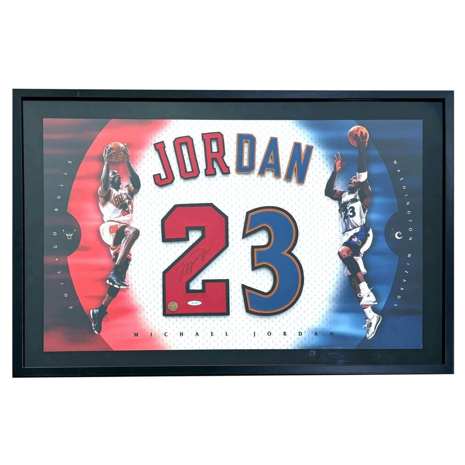 Upgrade your memorabilia collection with the ultimate addition - an exclusive Michael Jordan signed "Numbers" collage. This special piece features authentic jersey numbers from both the Chicago Bulls and Washington Wizards, the only two teams Jordan played for in his illustrious career. Each jersey number is meticulously stitched and taken directly from authentic jerseys he would have worn on the court during the times he actually played for the teams during the years he played. What makes this collage even better is that the autograph was signed around the time that he was playing for the Wizards, so it's an older piece with a lot of nostalgia instead of a new piece made in volume that you see being made everyday today.