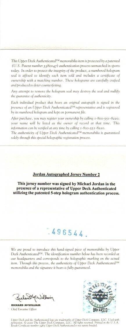 This luxury item comes in a sophisticated black custom frame measuring approximately 20" x 30" and boasts black matting and a plexiglass display. The autograph is authenticated by Upper Deck Authenticated (UDA), Jordan's personal autograph authentication company, with a tamper-proof silver security hologram and matching numbered card. This is the best authentication you can ever buy for Michael Jordan autographs! Elevate your collection with this rare piece, personally signed by "His Airness" himself. The framed collage you see pictured is the one you will receive.