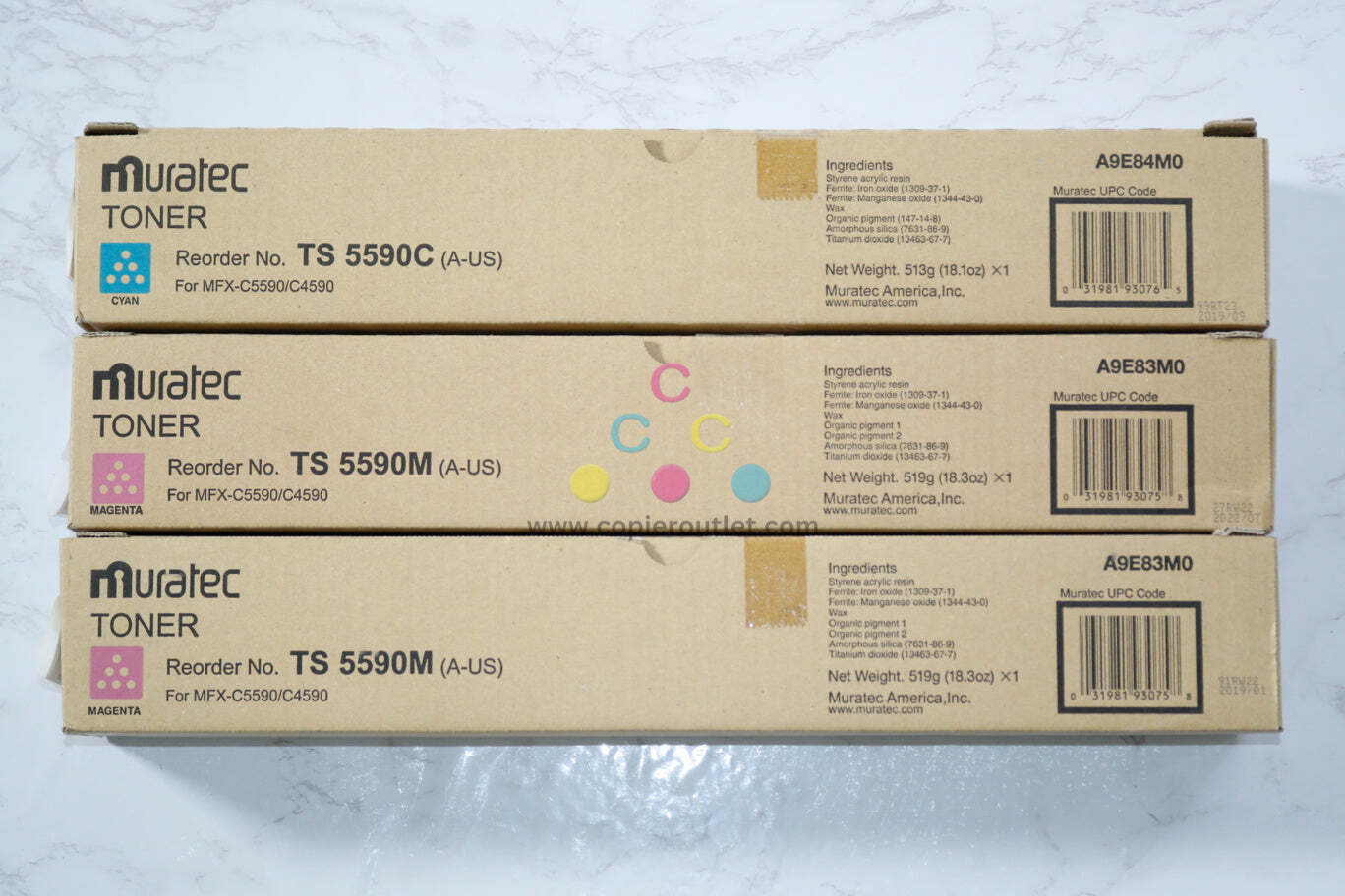 Lot Of 3 Genuine Muratec TS-5590 CMM Toner Cartridges Cyan (x1) - A9E84M0 Magenta (x2) - A9E83M0 For MFX-C5590N, MFX-C4590 New! Please Reference Photos SAME DAY SHIPPING!! For faster shipping service, please send us a message or contact us. Copier Clearance Center Copier Clearance Center was established in 1993. We buy and sell both domestically and internationally and have wide assortment of used copiers, fax machines and printers of all brands. All of our copiers are in house and available for your inspection. They all have been tested and rated for functions, cosmetics and overall appearance. We also sell genuine accessories of all popular brands. Our accessories include toners, imaging units, developers and copier parts such as fax board, fixing unit, fuser unit, roller, cleaning brush, drum blades etc. For more detailed information on our current inventory of Copiers and Accessories all potential buyers or their representatives are welcome to give us a call. We are more than happy to assist you with the pricing and guide you to find the copiers you wish to buy. Best Regards, On-Line Sales Team Copier Clearance Center Business Hours (Pacific Time): Monday-Friday: 9:00 am to 5:30 pm Copier Clearance Center Promo Video - YouTube Video will open in a new windowUsing the App? Paste link into a browser window: [isdntekvideo] All product and company names are trademarksTM or registered trademarks of their respective holders. Use of them does not imply any affiliation with or endorsement by them.