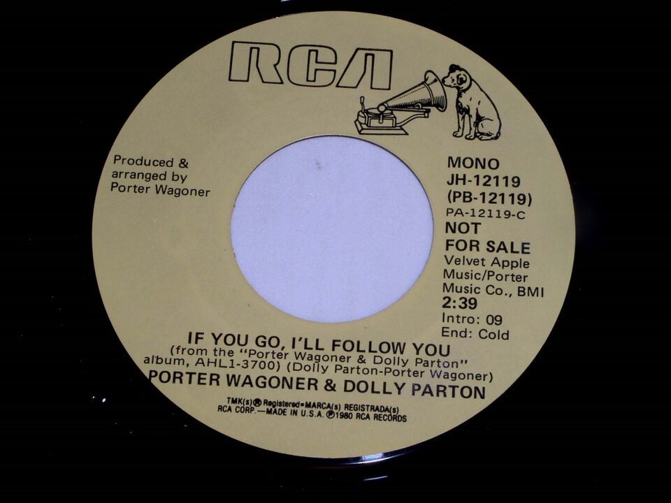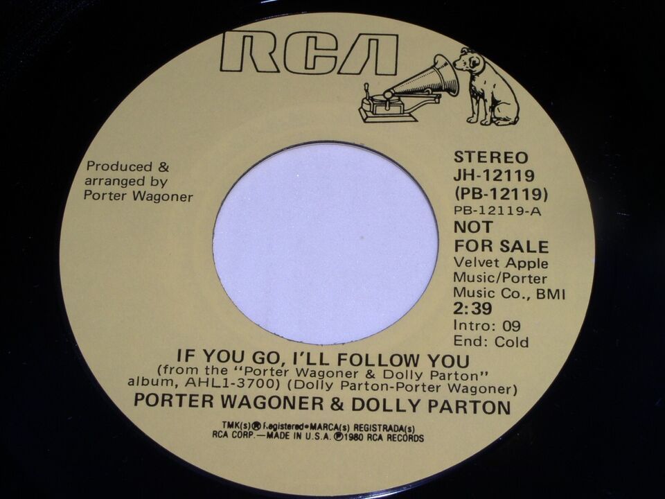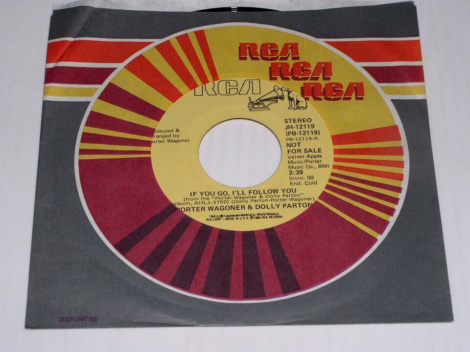 This is an original, vintage promotional 45 rpm phonograph record by Porter Wagoner and Dolly Parton entitled, "If You Go I'll Follow You". This is the mono/stereo issue. Record label RCA JH-12119. Comes with the original RCA paper sleeve as shown.