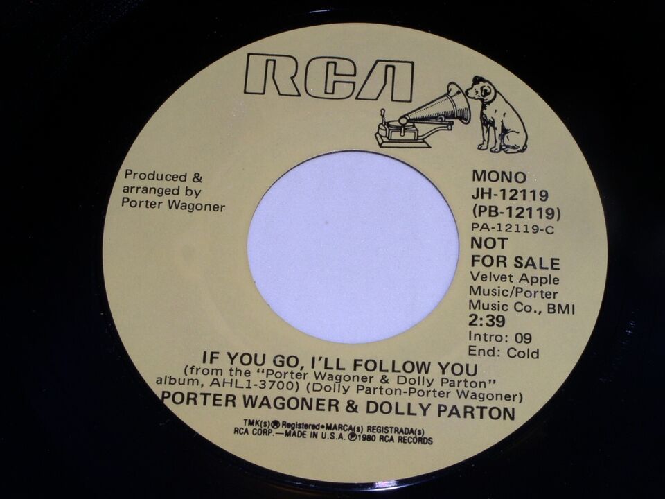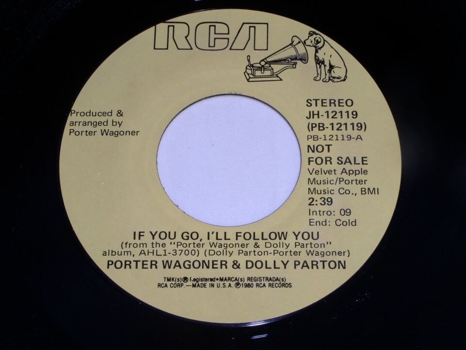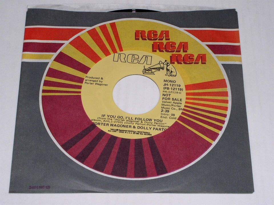 This is an original, vintage promotional 45 rpm phonograph record by Porter Wagoner and Dolly Parton entitled, "If You Go I'll Follow You". This is the mono/stereo issue. Record label RCA JH-12119. Comes with the original RCA paper sleeve as shown.