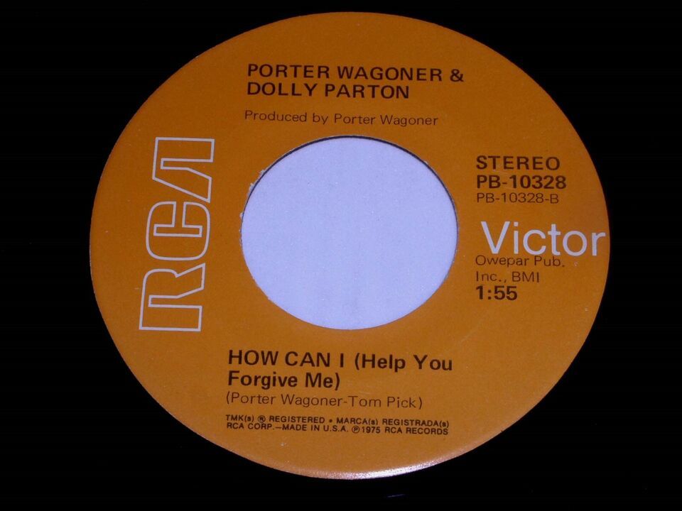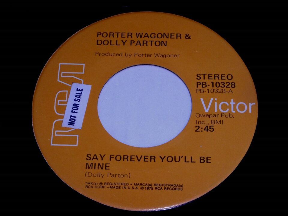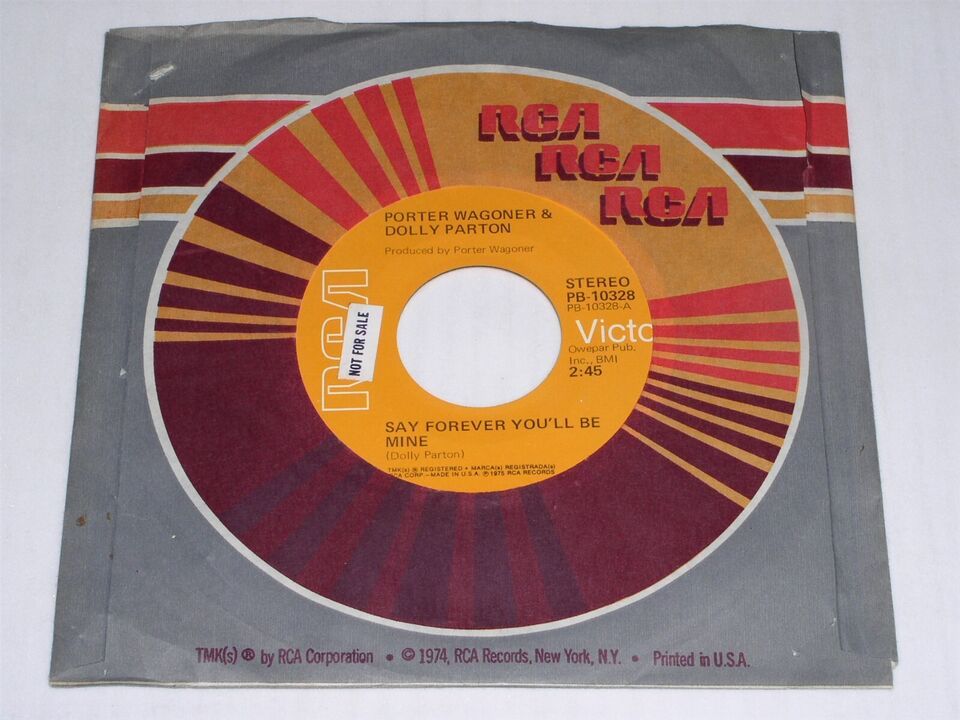 This is an original, vintage 45 rpm phonograph record by Porter Wagoner and Dolly Parton entitled, "Say Forever You'll Be Mine". Flipside: "How Can I Help You Forgive Me". Record label RCA PB-10328. Comes with the original RCA paper sleeve as shown.