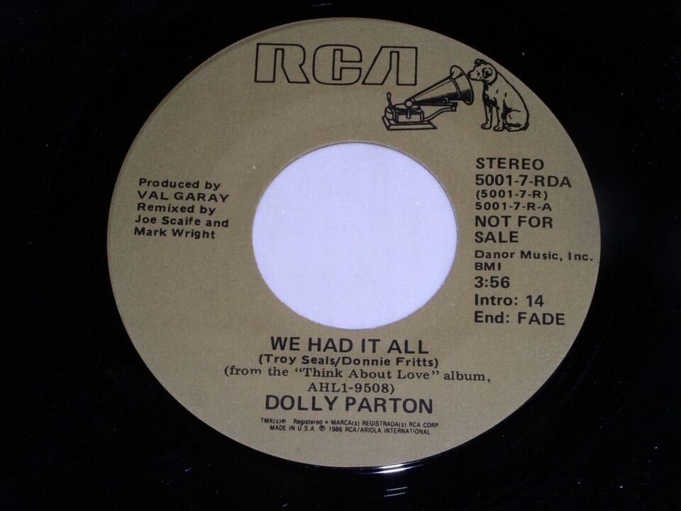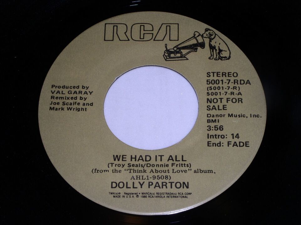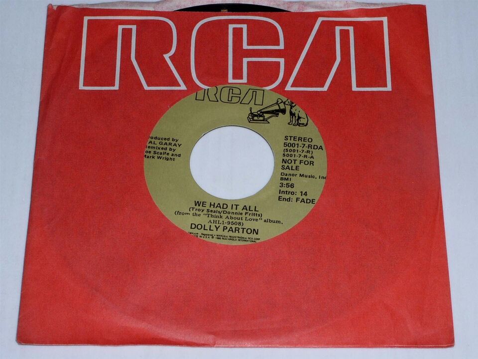This is an original, vintage promotional 45 rpm phonograph record by Dolly Parton entitled, "We Had It All". Same flipside. Record label RCA 5001-7-RDA. Comes with the original RCA paper sleeve as shown.