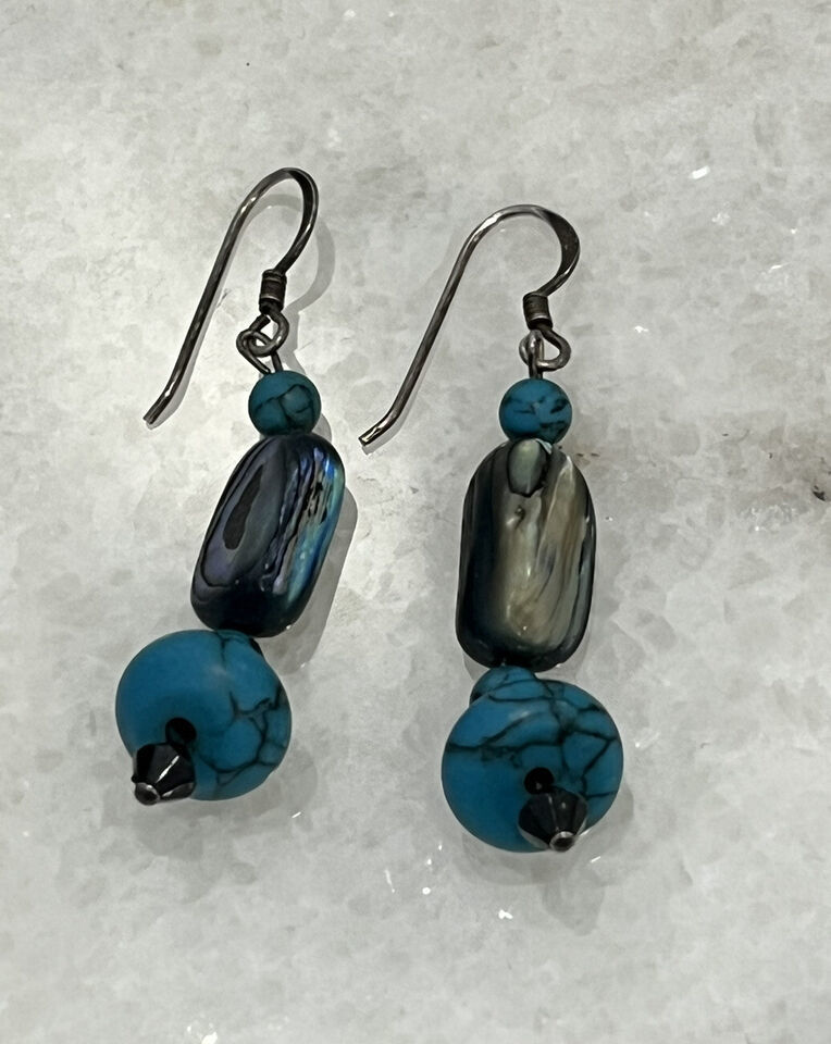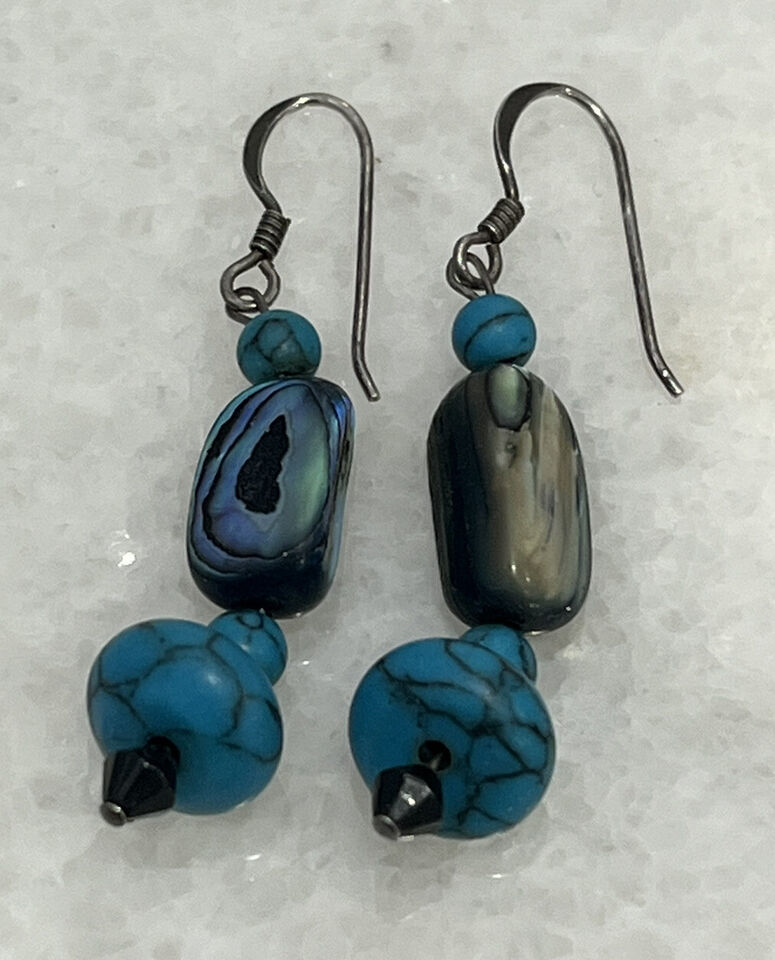Sterling Silver 925 Faux Turquoise & Abalone Drop Dangle Hook Earrings