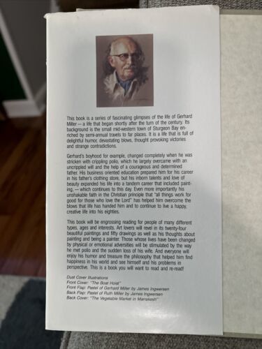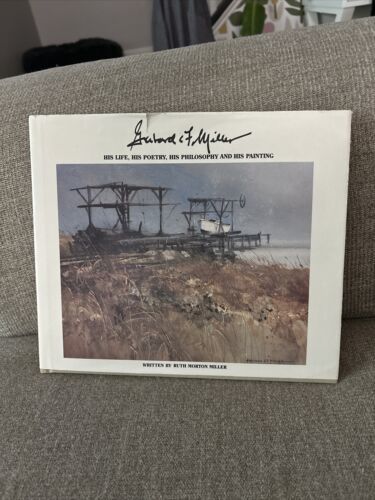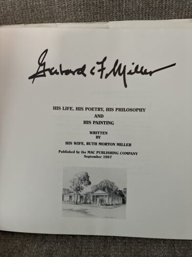 This is a signed hardcover book titled "Gerhard C F Miller: His Life, His Philosophy and His Painting" by Ruth Morton Miller. The book was published in 1987 by Miller and falls under the art and culture genre.
