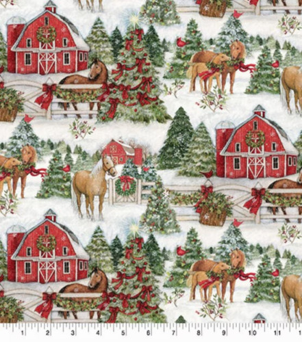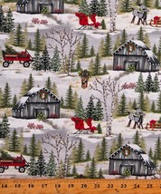 Cotton It's Christmas Time Winter Scenic Barns Sleds Sleighs Red Wagons Winter Holidays Cotton Fabric Print by the Yard (3471-90)