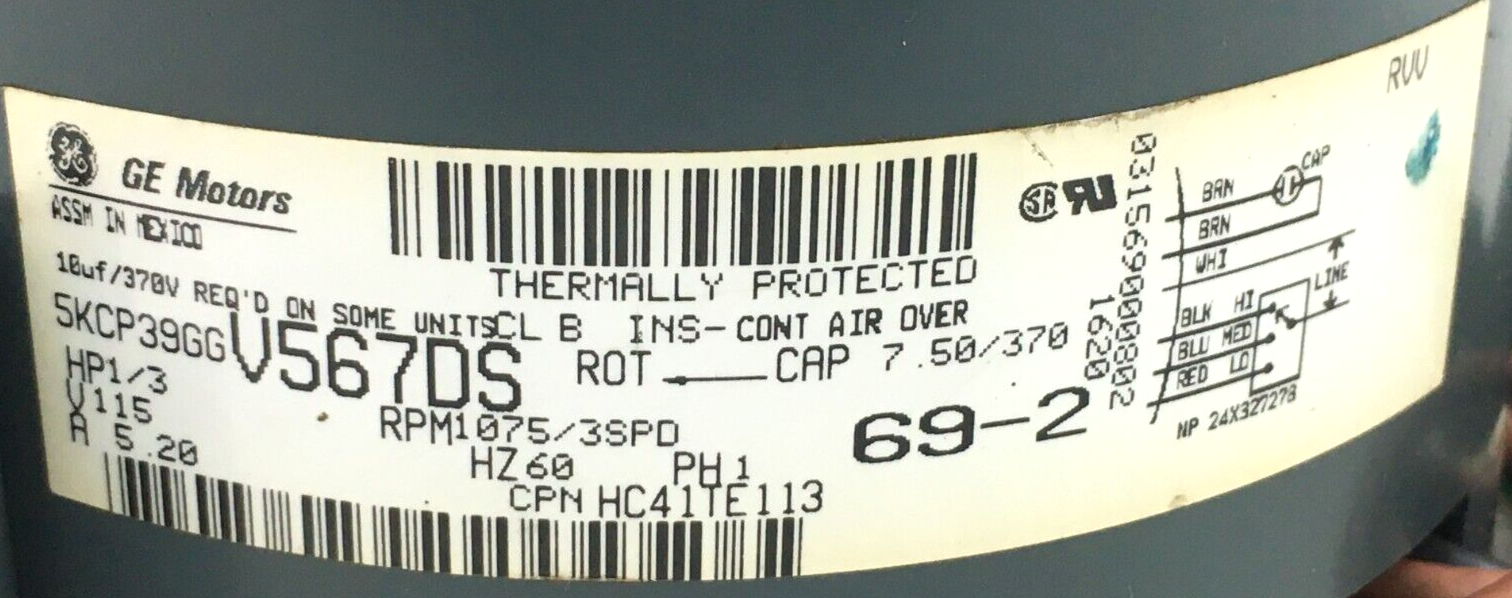GE Motors 5KCP39GGV567DS Blower Motor 1/3HP 1075RPM 3SPD 115V HC41TE113 #MB158